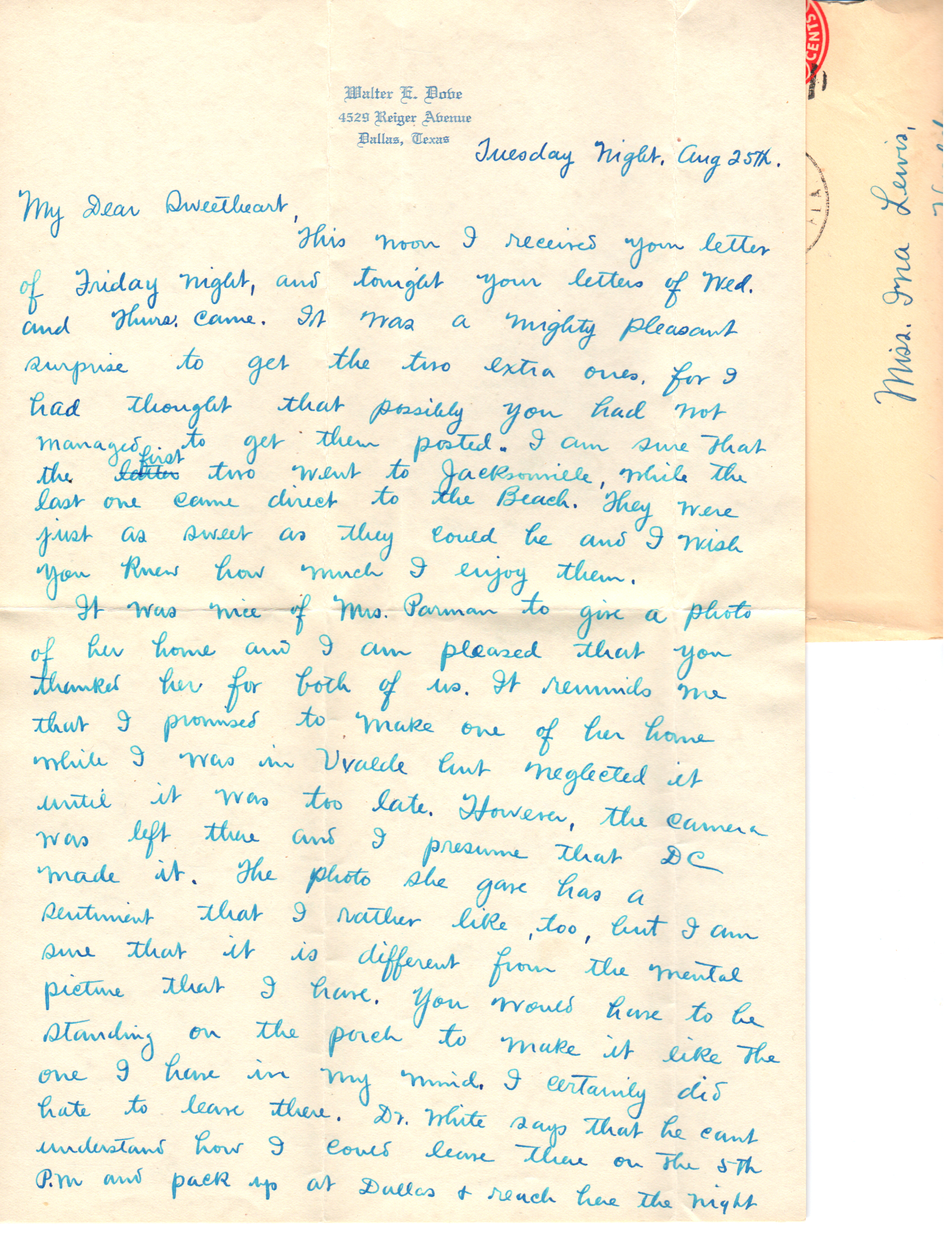 It was nice of Mrs. Parman to give a photo of her home and I am pleased that you thanked her for both of us. It reminds me that I promised to make one of her home while I was in Uvalde but neglected it until it was too late. However, the camera was left there and I presume that DC made it. The photo she gave has a sentiment that I rather like, too, but I am sure that it is different from the mental picture that I have. You would have to be standing on the porch to make it like the one I have in my mind. I certainly did hate to leave there. Dr. White says that he can’t understand how I could leave there on the 5th P.M. and pack up at Dallas & reach here the night of the 9th. I had to hustle, but I wanted to be with you as long as possible. I’ll never forget how excited Mrs. Parman was when we told her that you were leaving with me. Next to you and I, she will be more pleased over our marriage than anyone else. It will be the happiest day of my life, Dear, and I hope and believe that it will be the beginning of a lot of happiness for both of us.