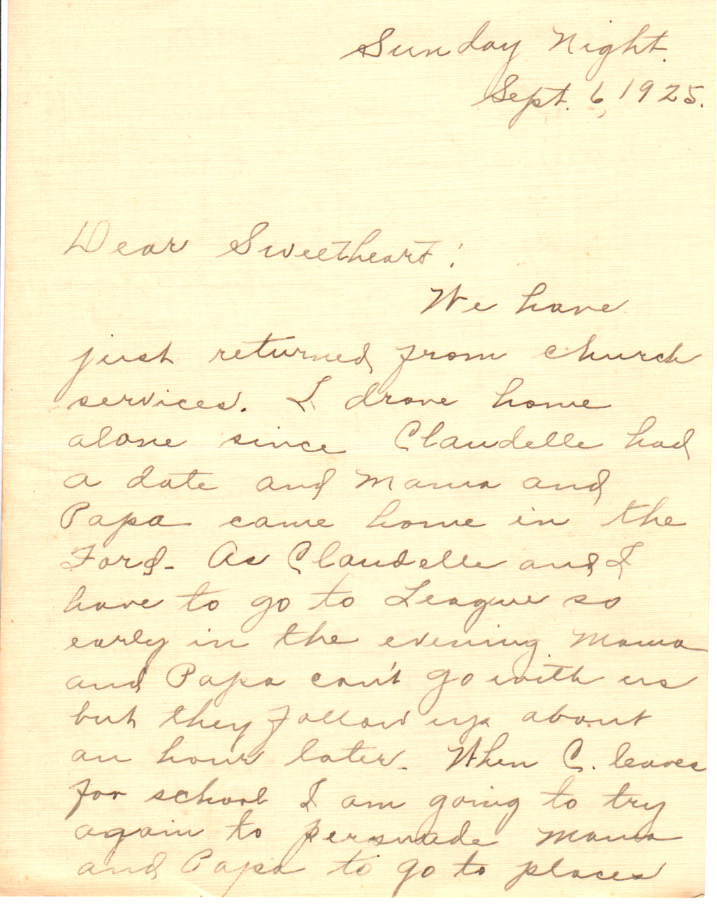 We have just returned from church services. I drove home alone since Claudelle had a date and Mama and Papa came home in the Ford. As Claudelle and I have to go to League so early in the evening, Mama and Papa can’t go with us but they follow up about an hour later. When C. leaves for school I am going to try again to persuade Mama and Papa to go to places more than they do now. I want them to get in the habit so that they will not be so lonely when we both are away. They are accustomed now to having young people around and that keeps them feeling younger, but I can’t bear the idea of their settling down out here after we leave and growing old. They are both inclined to be very much of “stay at homes.”