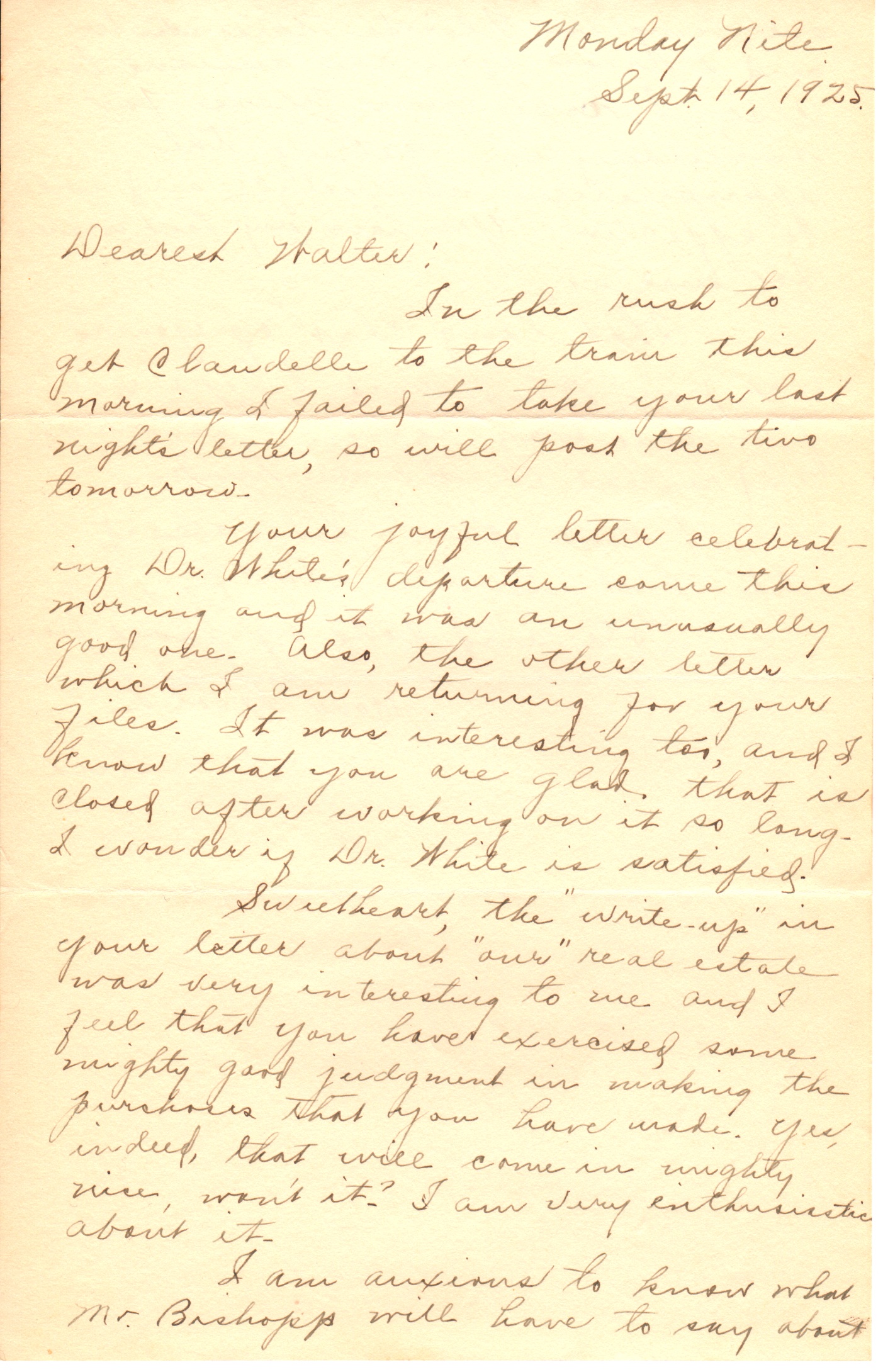 Sweetheart, the “write-up” in your letter about “our” real estate was very interesting to me and I feel that you have exercised some mighty good judgement in making the purchases that you have made. Yes, indeed, that will come in mighty nice, won’t it? I am very enthusiastic about it.