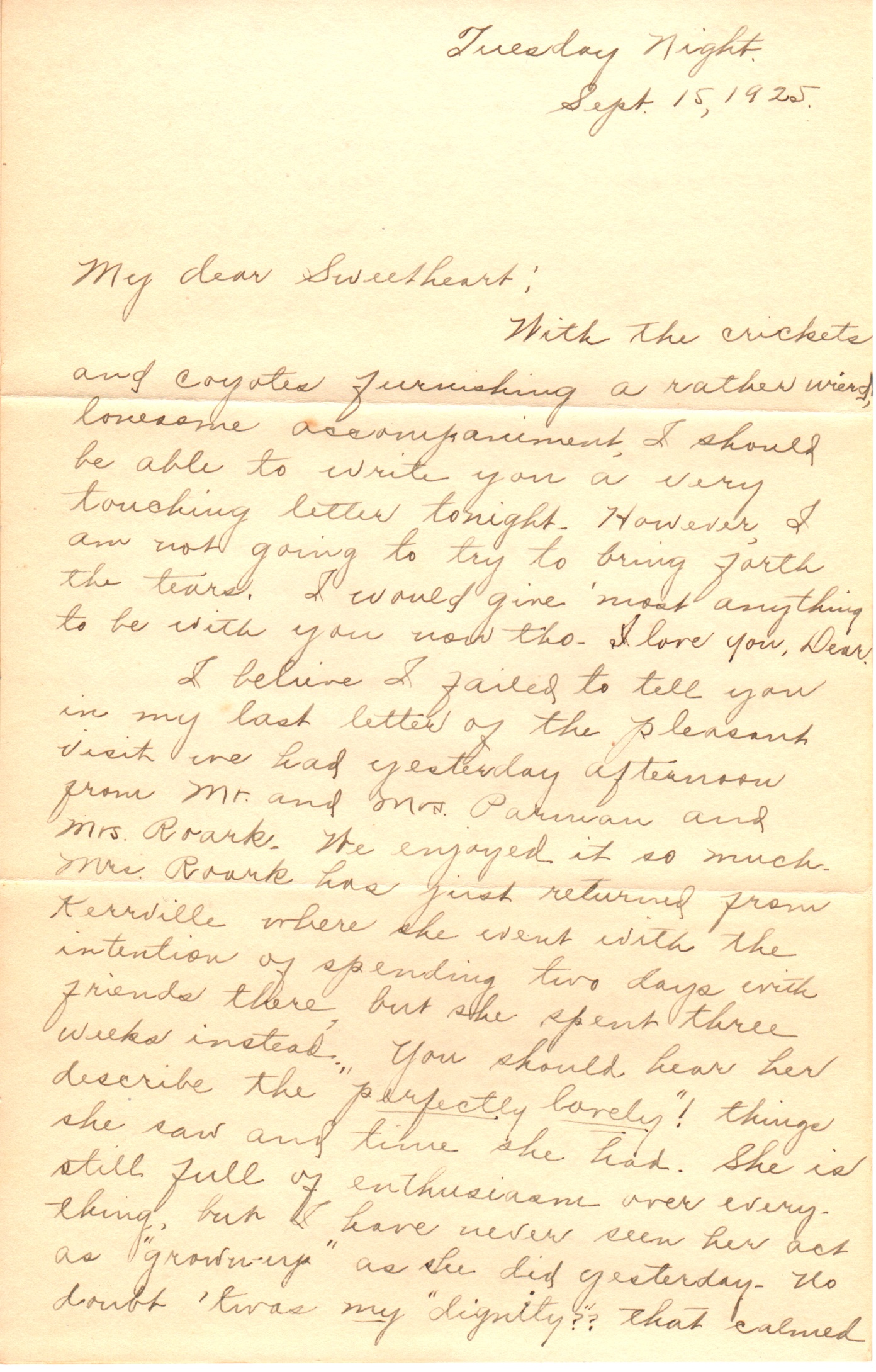 With the crickets and coyotes furnishing a rather weird, lonesome accompaniment, I should be able to write you a very touching letter tonight. However, I am not going to try to bring forth the tears. I would give ‘most anything to be with you now though. I love you, Dear.