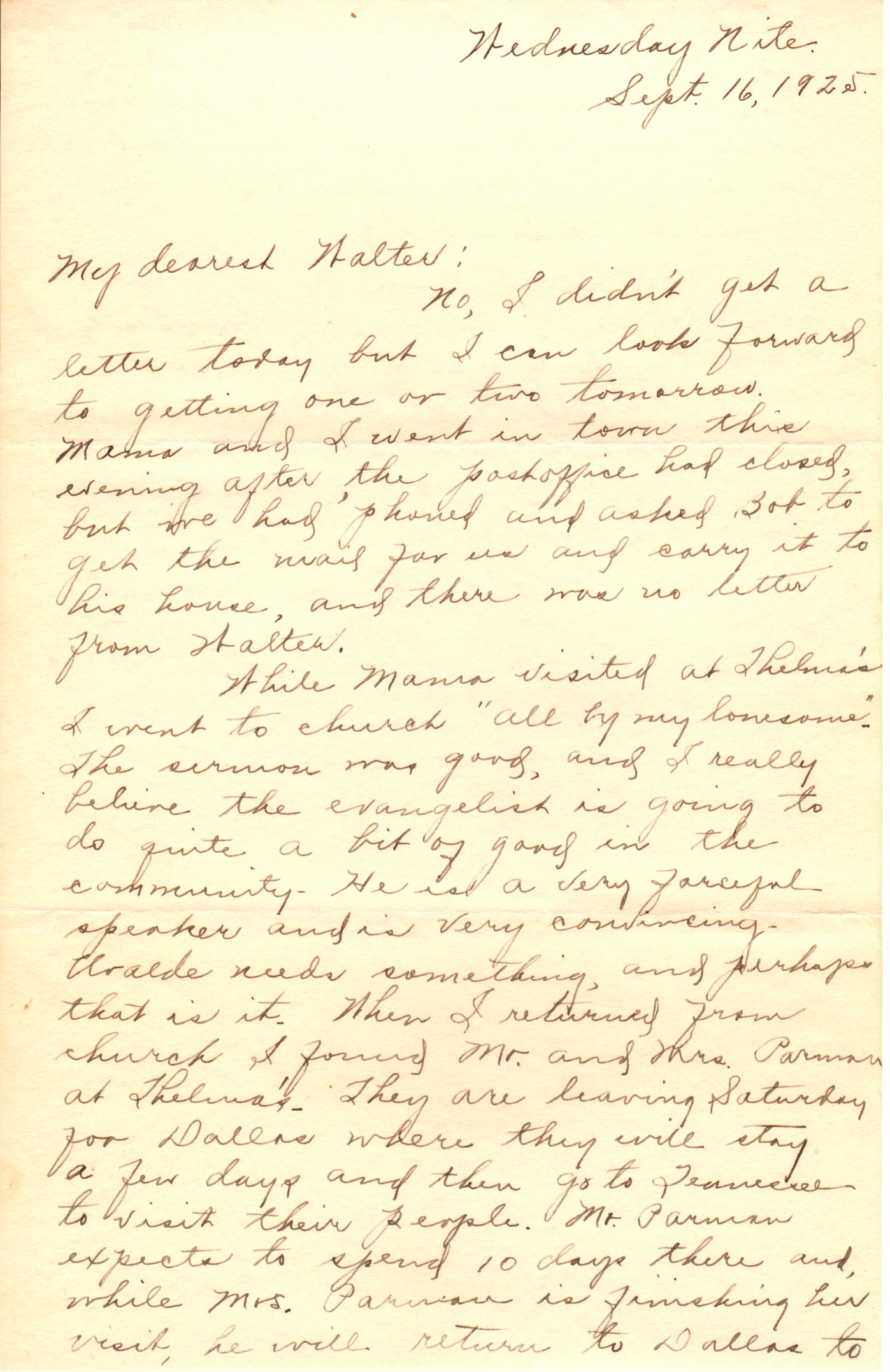 No, I didn’t get a letter today but I can look forward to getting one or two tomorrow. Mama and I went in town this evening after the post office had closed, but we had ‘phoned and asked Bob to get the mail for us and carry it to his house, and there was no letter from Walter.