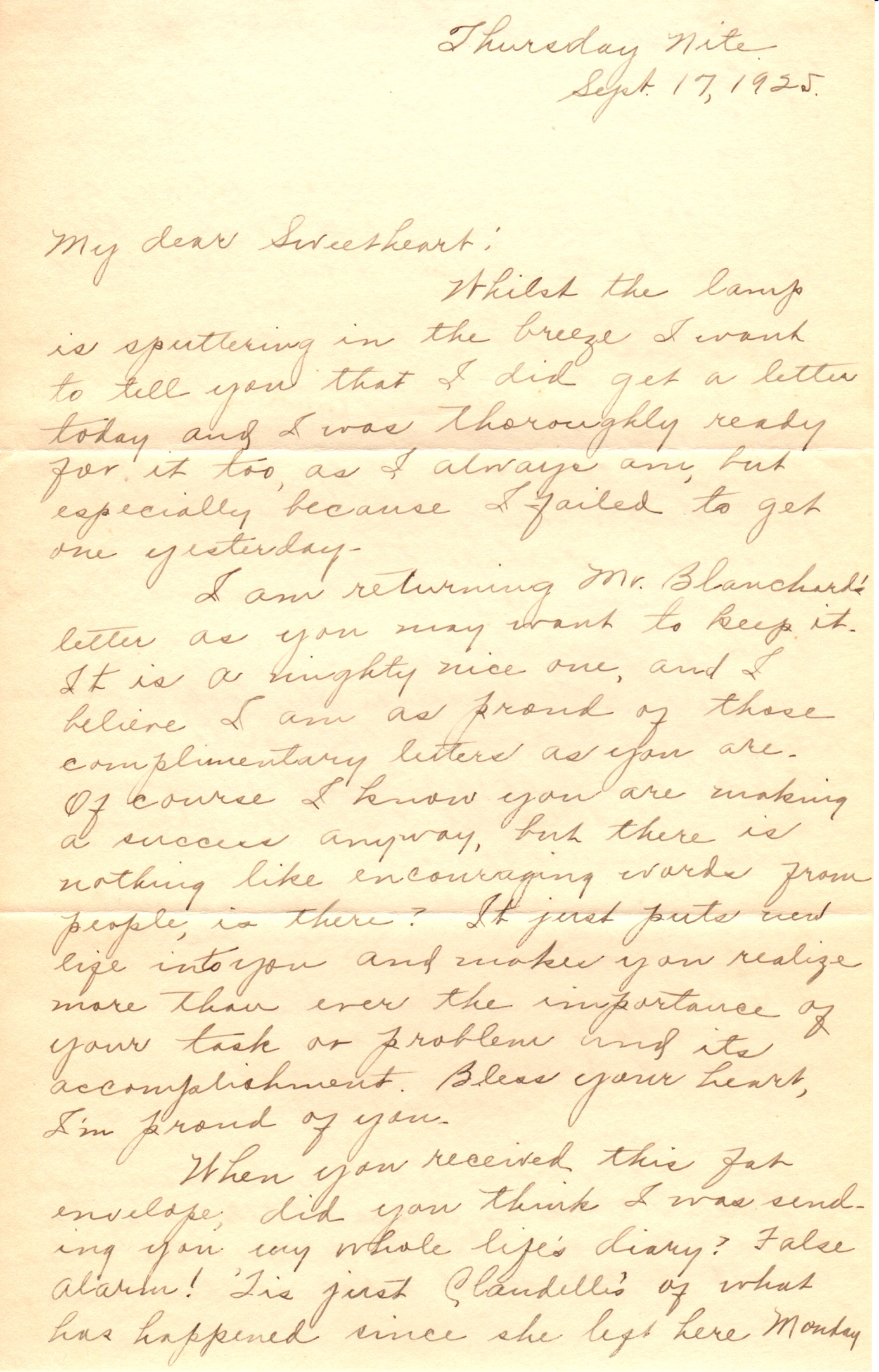 I am returning Mr. Blanchard’s letter as you may want to keep it. It is a mighty nice one, and I believe I am as proud of those complimentary letters as you are. Of course I know you are making a success anyway, but there is nothing like encouraging words from people, is there? It just puts new life into you and makes you realize more than ever the importance of your task or problem and its accomplishment. Bless your heart, I’m proud of you.