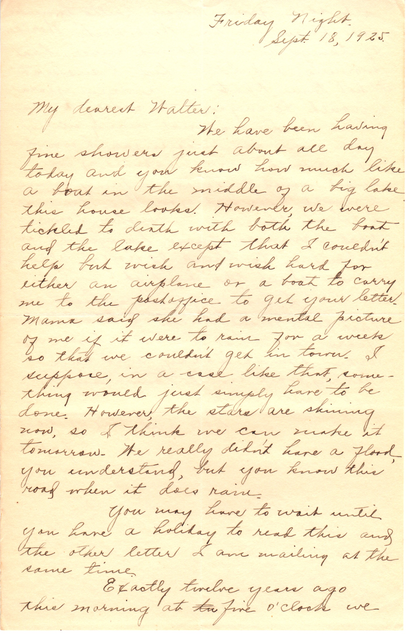 We have been having fine showers just about all day today and you know how much like a boat in the middle of a big lake this house looks. However, we were tickled to death with both the boat and the lake except that I couldn’t help but wish and wish hard for either an airplane or a boat to carry me to the post office to get your letter. Mama said she had a mental picture of me if it were to rain for a week so that we couldn’t get in town. I suppose, in a case like that, something would just simply have to be done. However, the stars are shining now, so I think we can make it tomorrow. We really didn’t have a flood, you understand, but you know this road when it does rain.