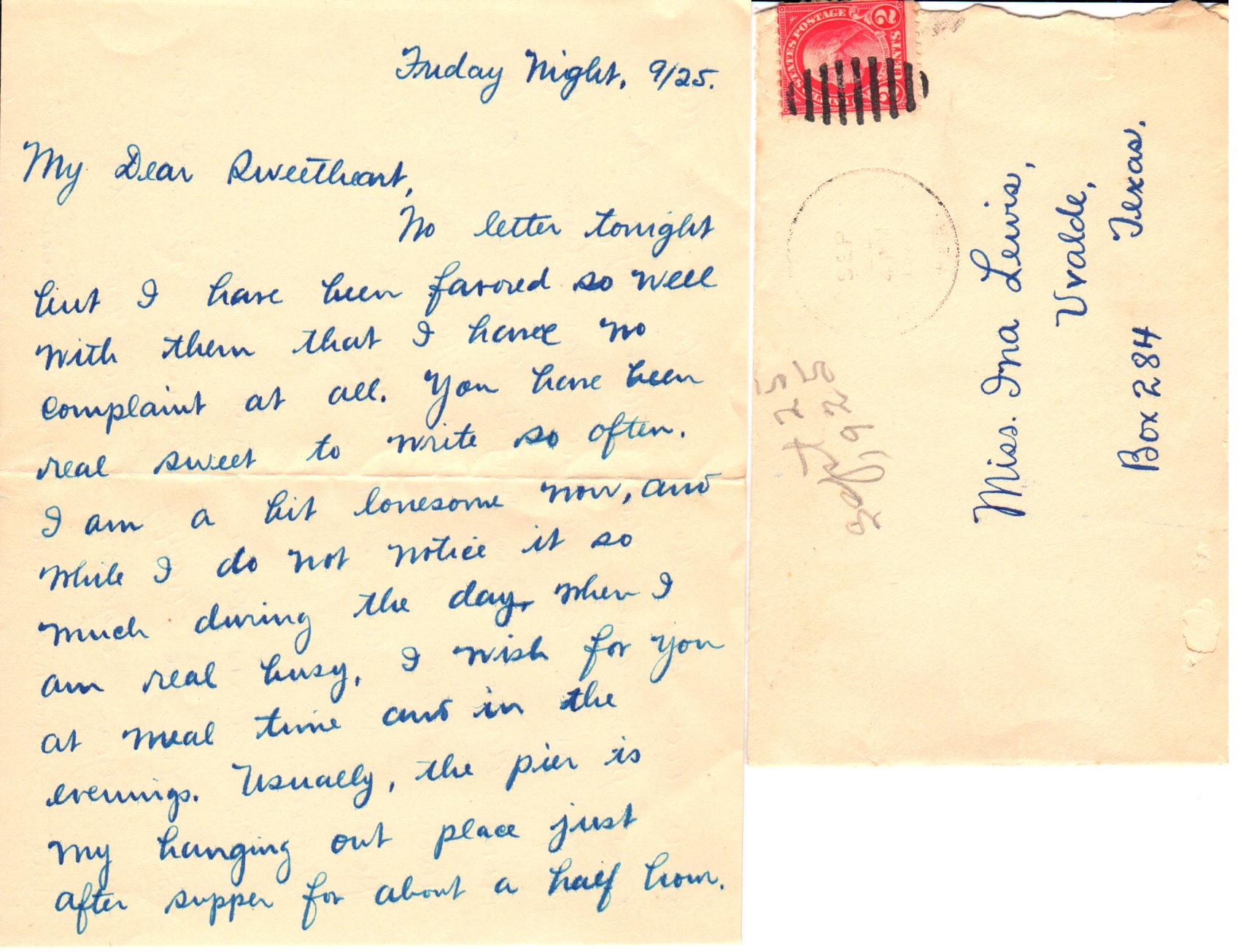 No letter tonight but I have been favored so well with them that I have no complaint at all. You have been real sweet to write so often. I am a bit lonesome now, and while I do not notice it so much during the day, when I am real busy, I wish for you at meal time and in the evenings. Usually, the pier is my hanging out place just after supper for about a half hour. It is cool out there and to watch the cars pass and the bathers enjoy the surf makes a restful pass time. They don’t dance every night now, but only about twice a week. There are fewer people in the surf than during the season.