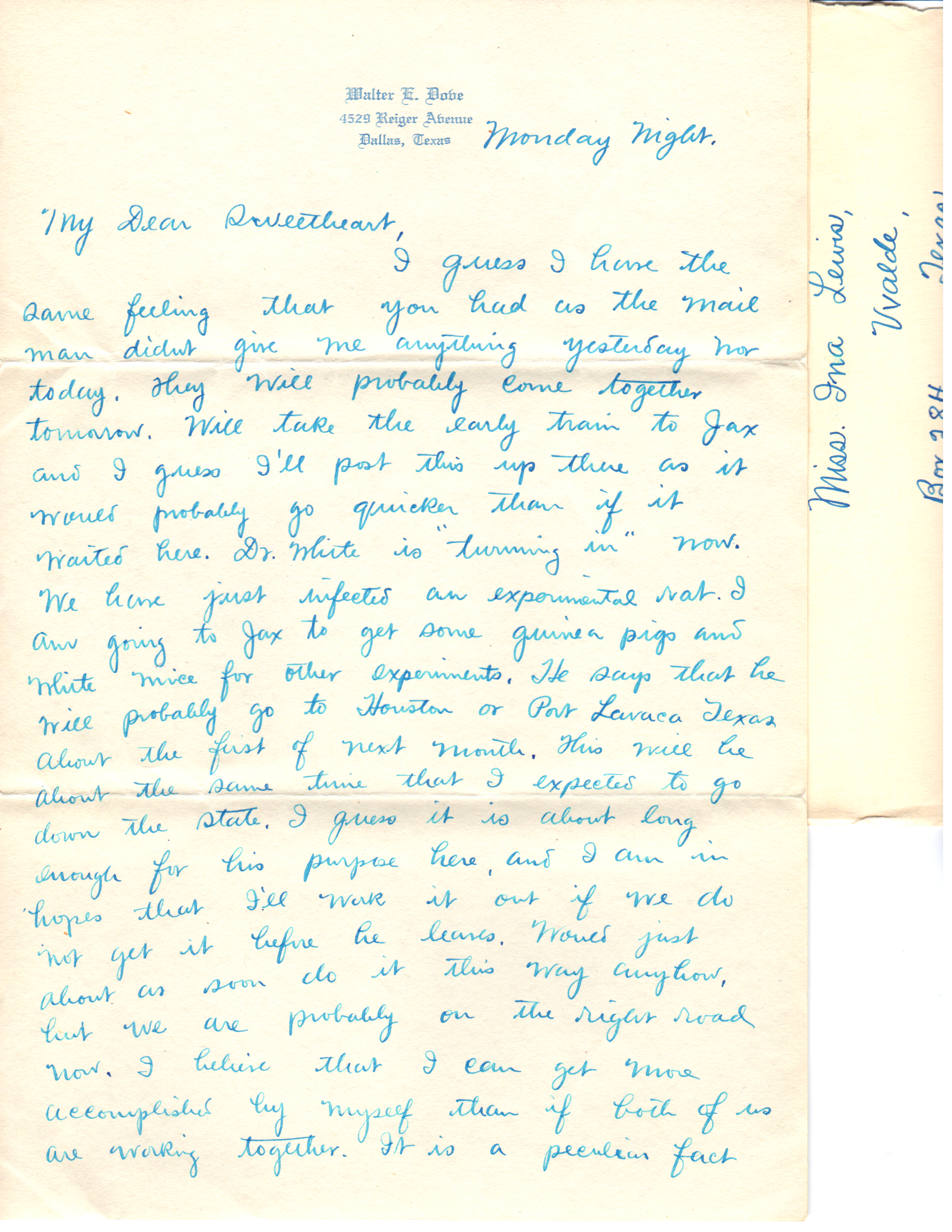 I am posting a letter to Texas for Dr. White tonight in which he tells them that he expects to leave about the latter part of the month. I can’t say that he has helped very much, but the fact that he was here and is an MD adds some prestige. I don’t expect to have him down here with me again, nor any other person showing symptoms of laziness and eagerness to get in on the credit end of the problem. We haven’t pushed the problem ahead any, and what we have done has been more of a confirmation of some of my results down here last spring and at Dallas just after that. The laboratory technique from Johns Hopkins was about the same as what I picked up in literature while in Washington. When he leaves, I’ll have the thing to work out. I expect to go down the state about the same time that he leaves, and after about a month down there I’ll probably pick up the problem here and push it. I think I can get Mr. Bishopp to consent to my staying with it all winter and spring. I believe this is the thing to do. We have some animals infected, or at least we hope they are infected but we have not been able to produce creeping eruption with the infection. Possibly, we haven’t tried the right stages and maybe we have not made the conditions just right. It looks as though we have the right thing, but it remains to be seen. It looks like the same thing I worked with during the spring.