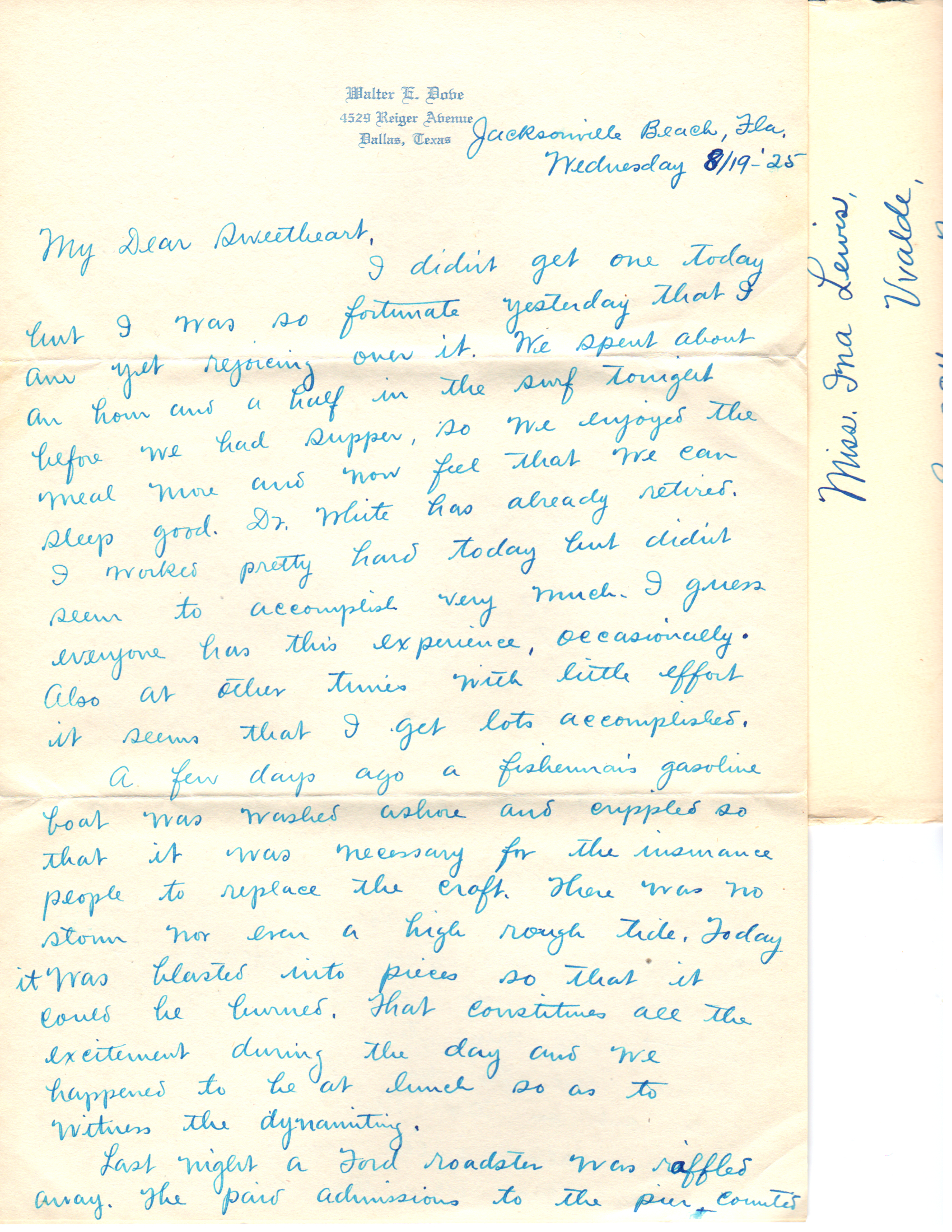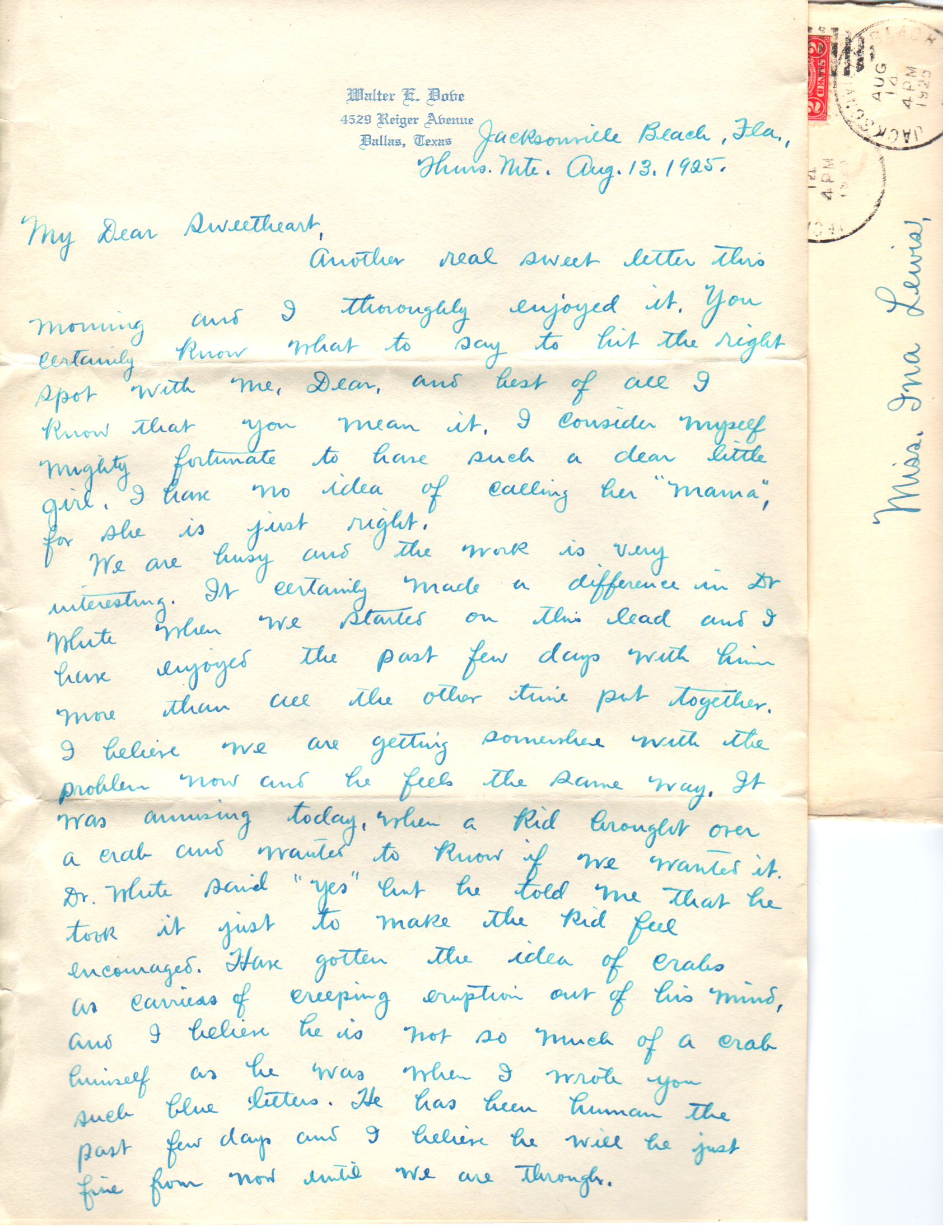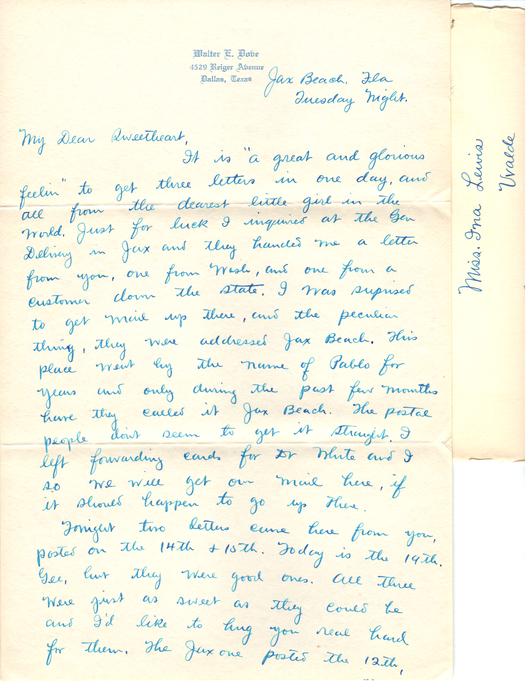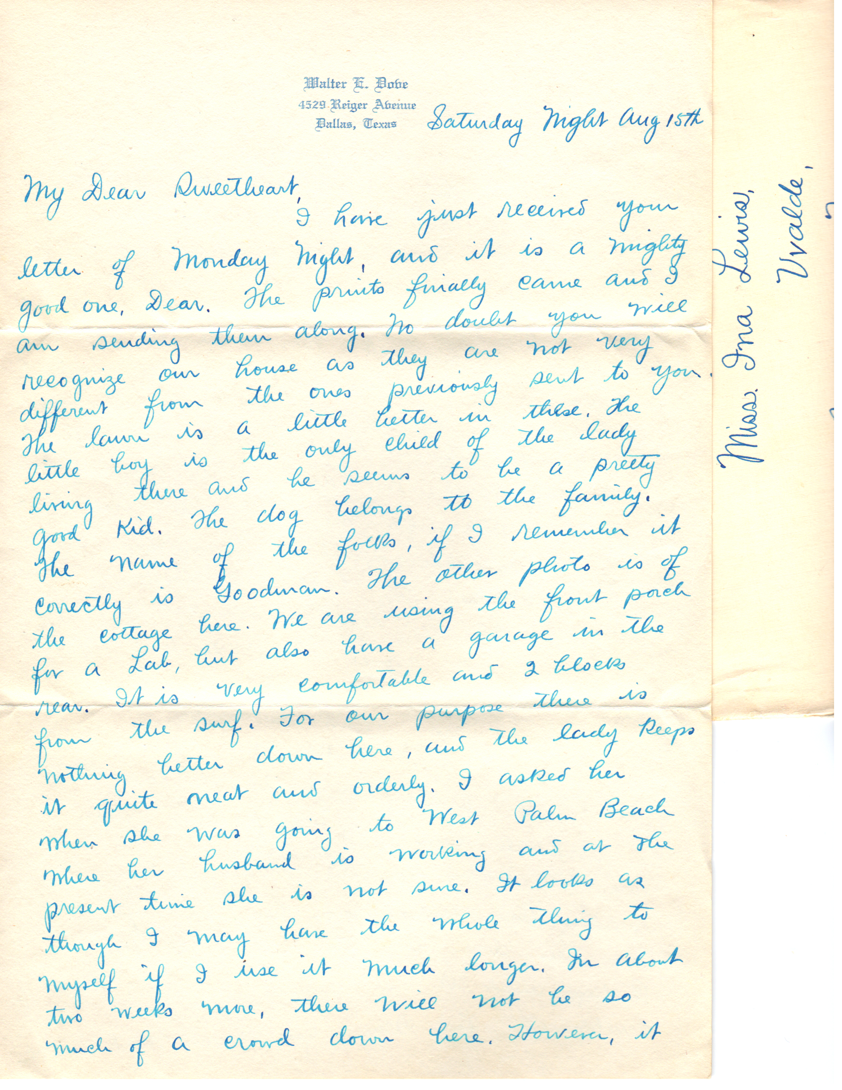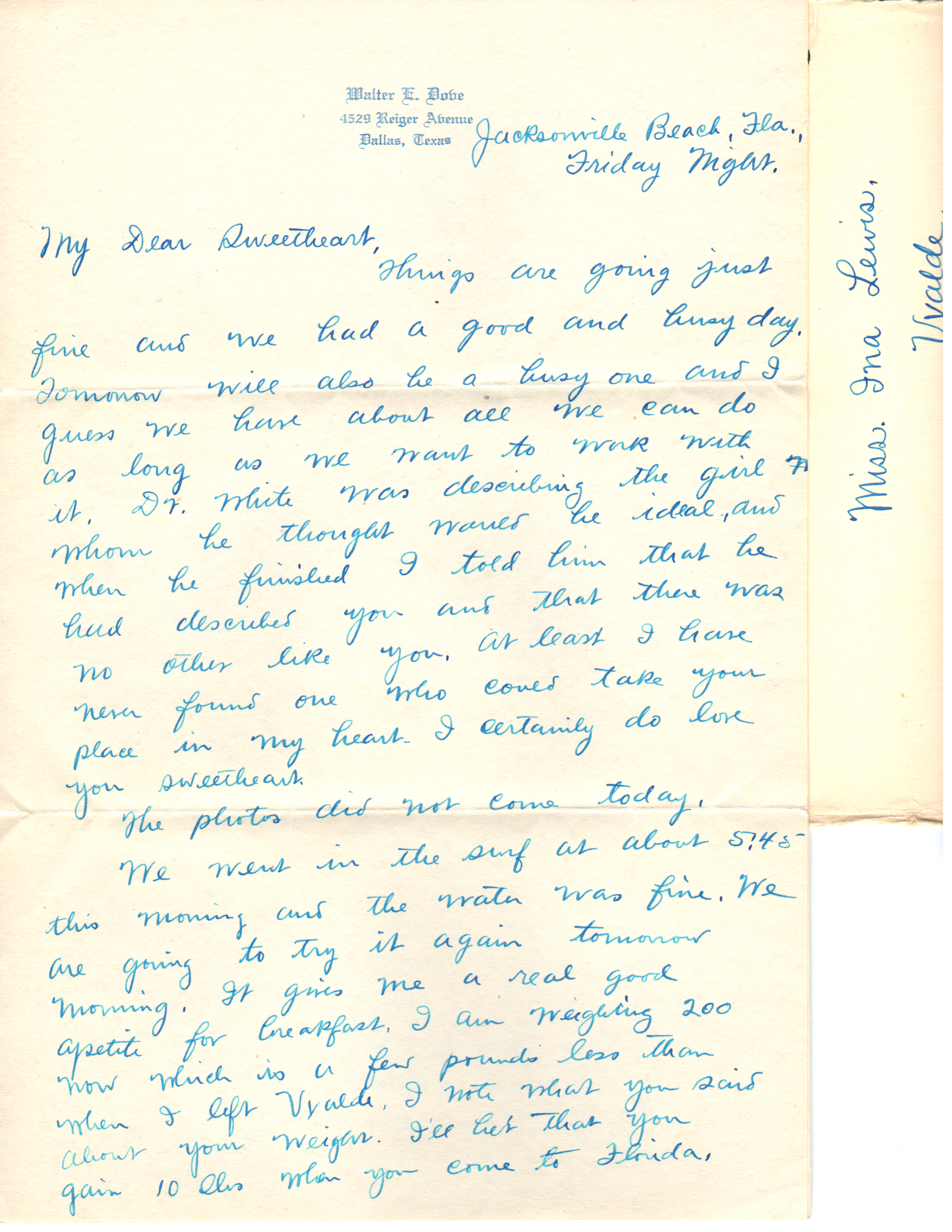 One reason why I suggested about the trunk was on account of the possibility of coming direct to Florida and in which event there would be little use for one. I don’t intend to do an awful lot of traveling, but I do want you with me when I have some to do. Most of it will probably be in the state so that we really wouldn’t need one. It seems that I have an awful lot of luggage as it is, and I sometimes wonder where we will find attic and closet room for a lot of it. I agree with you in that trunks are not ornamental.