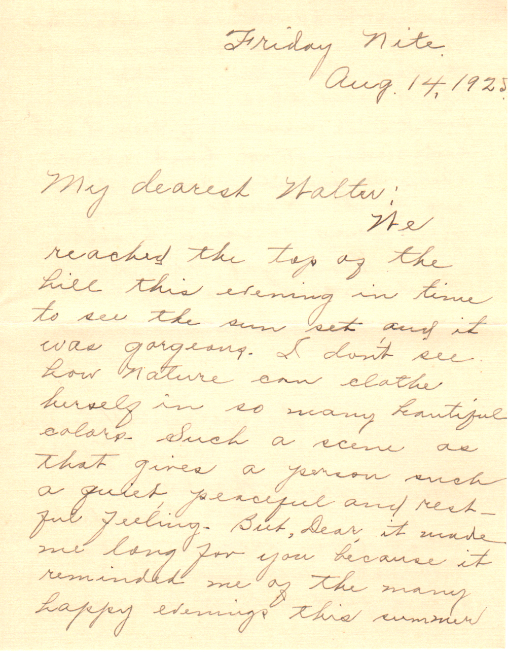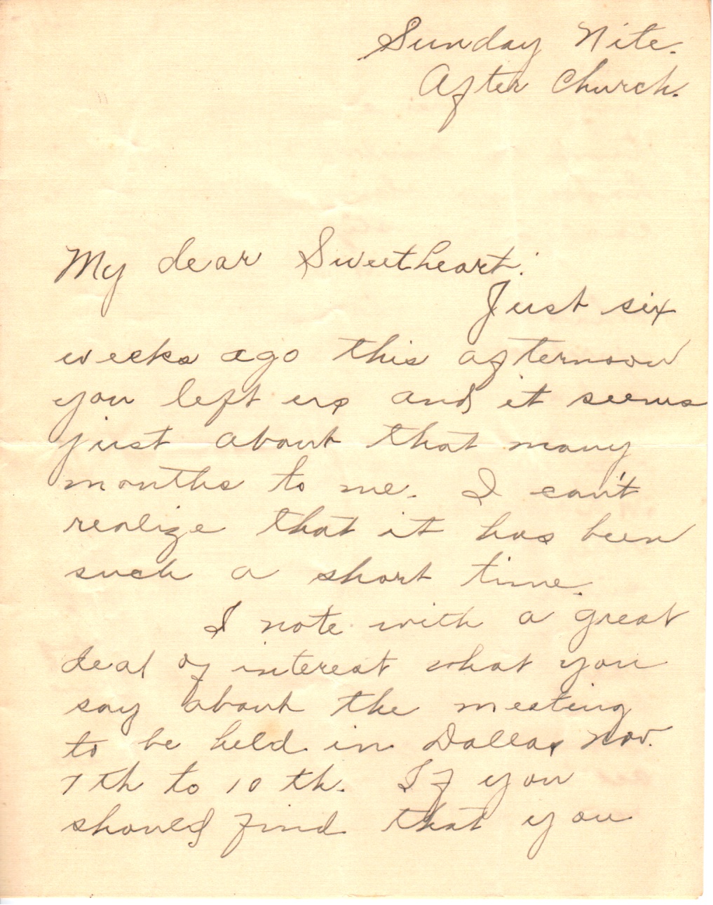 It came at noon today. A mighty good one too. It certainly seems longer than six weeks to me since I left Uvalde and I agree with you that it has seemed to be about six months. It was real sweet of you to say that the early portion of November would suit you, or either before or after the Dallas meeting. Don’t let me do the suggesting on the date, Dear, for you have a perfect right to set the time which suits you best. I mentioned it as a possibility only, and I want you to know that I feel that this is a matter for you to decide and you can have it when you want it. I’ll gladly tell you as far in advance as it is possible, what time would seem to fit in as convenient, and you can set the time you want. I consider that the question of the date should be the girl’s privilege. I certainly don’t want to be old maidish enough to want the say so on everything, for I have been experiencing some of this with my co-worker. I have made some pledges to myself that I am going to try and not be that way, especially with you.