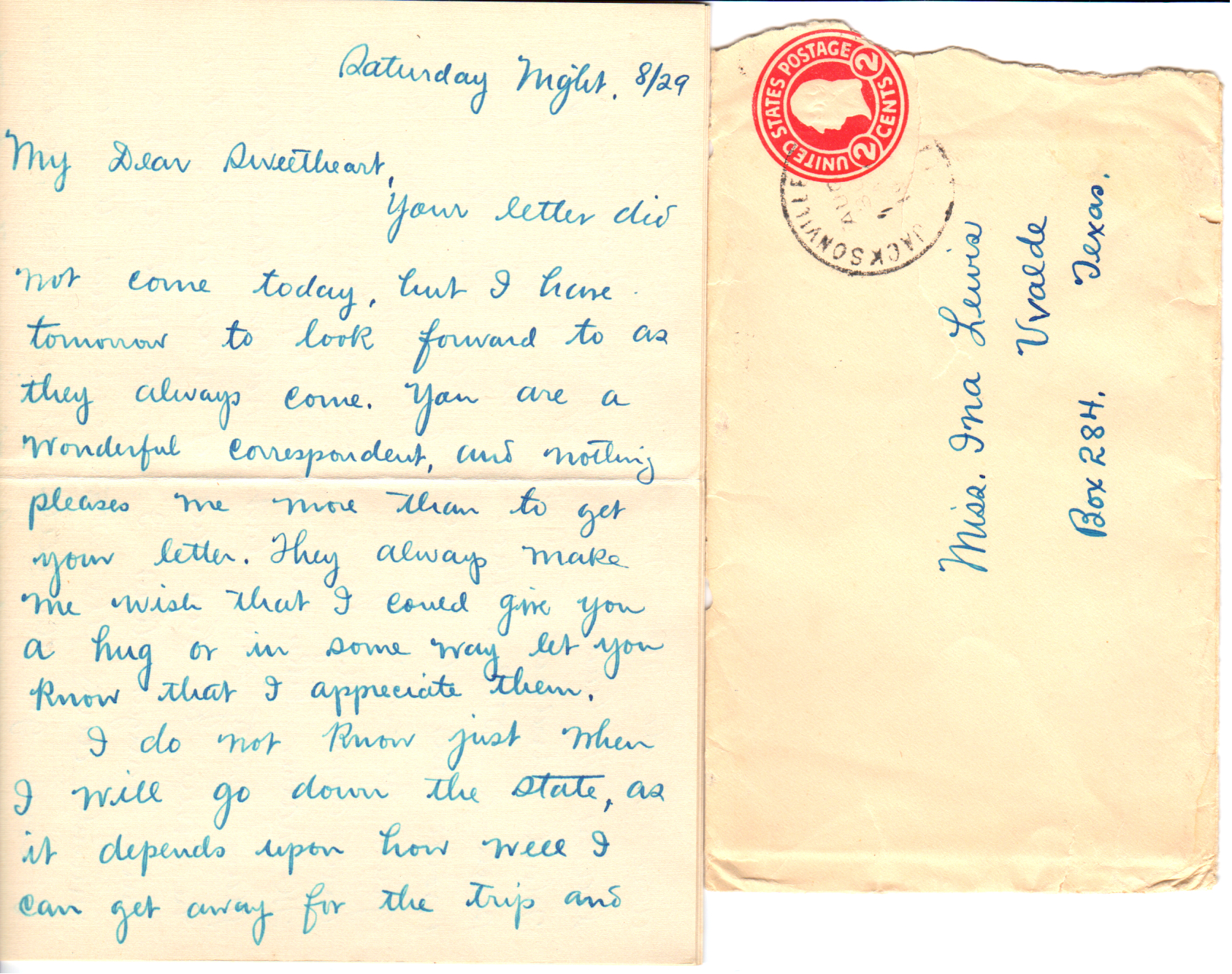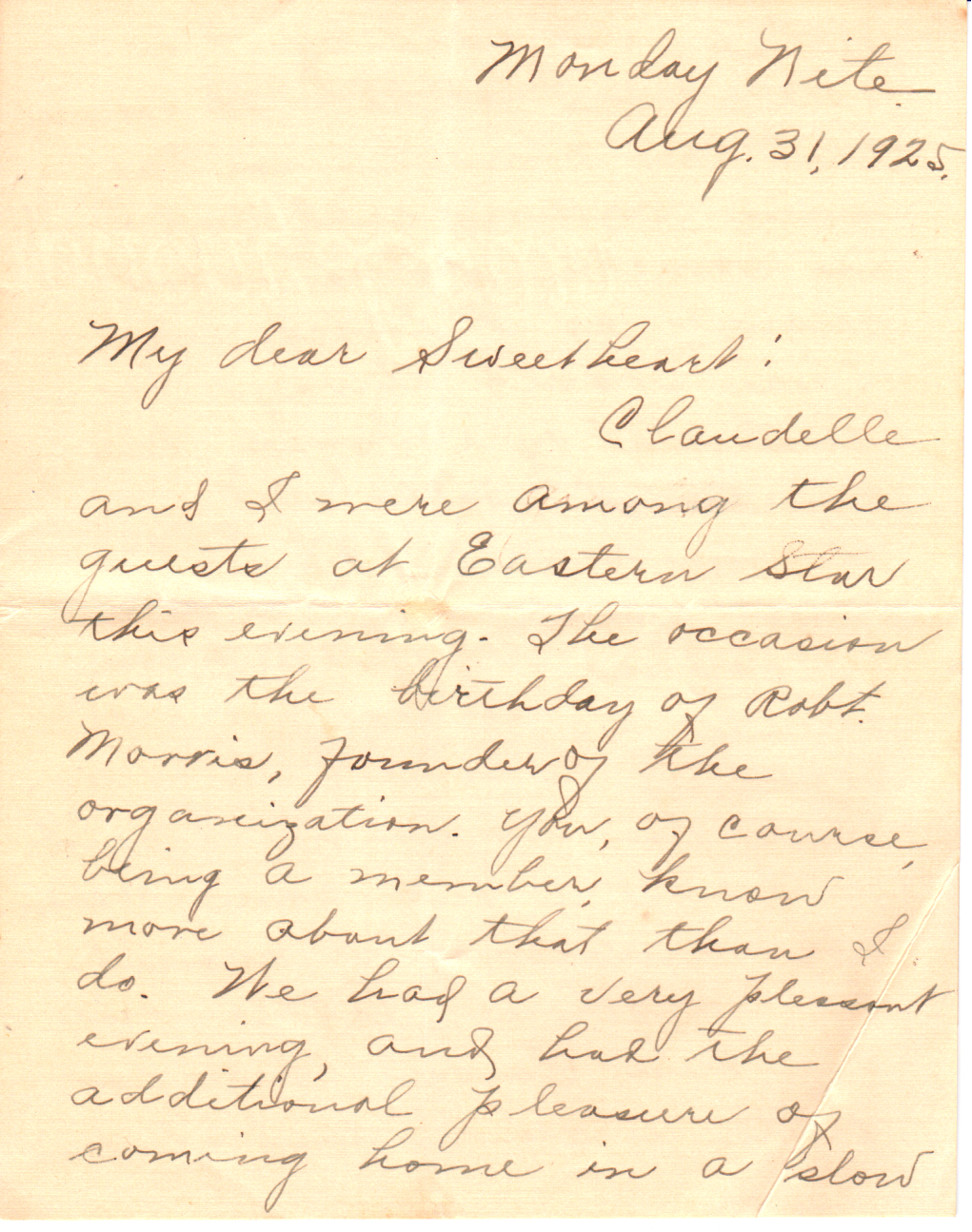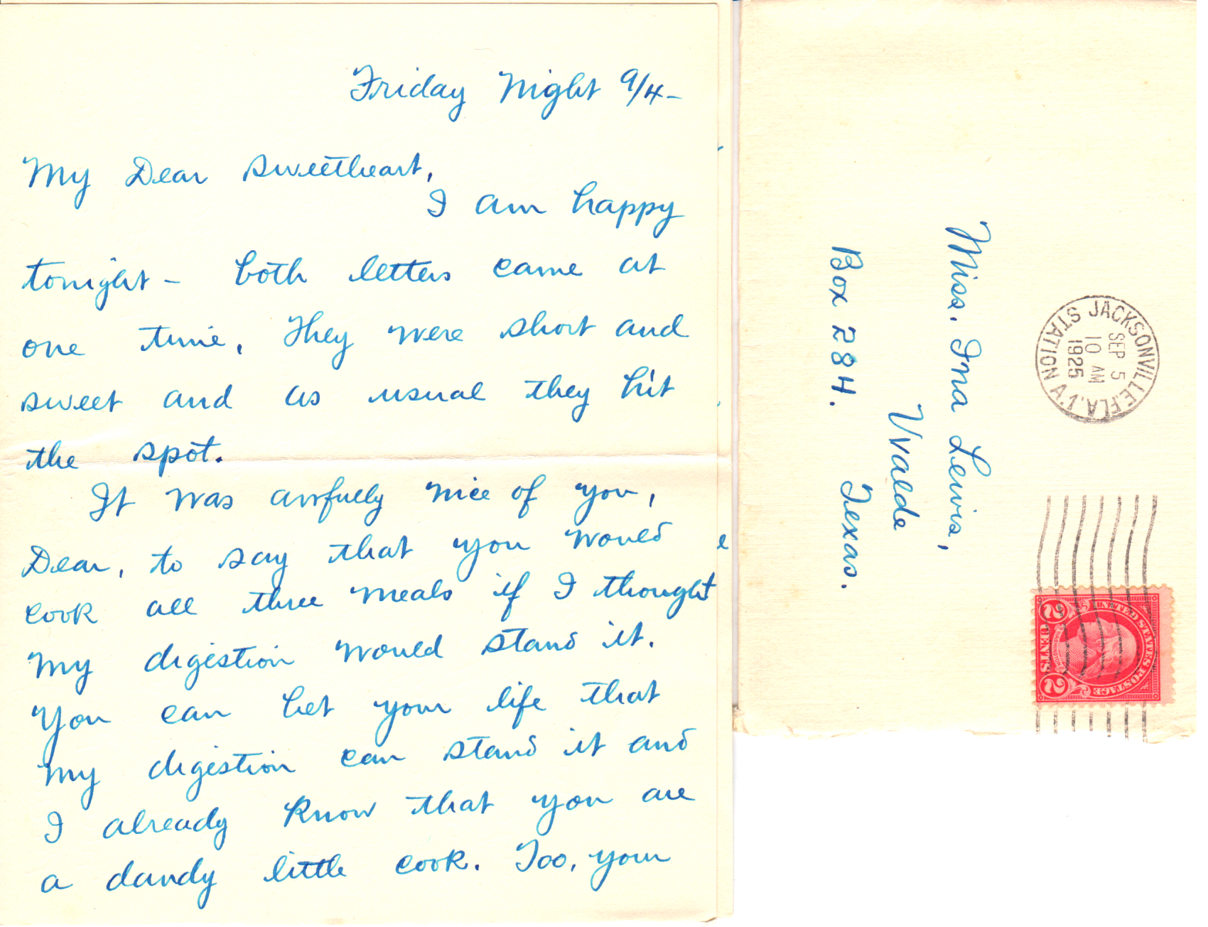 It was awfully nice of you, Dear, to say that you would cook all three meals if I thought my digestion would stand it. You can bet your life that my digestion can stand it and I already know that you are a dandy little cook. Too, your taste is very similar to mine and I know that both of us will enjoy the meals. I guess I’ll have to drink coffee by myself but this will be all right. Mother Lewis is a good cook and from what I know of your cooking, I know that you are a good one too. I am looking forward with pleasure to yours.*