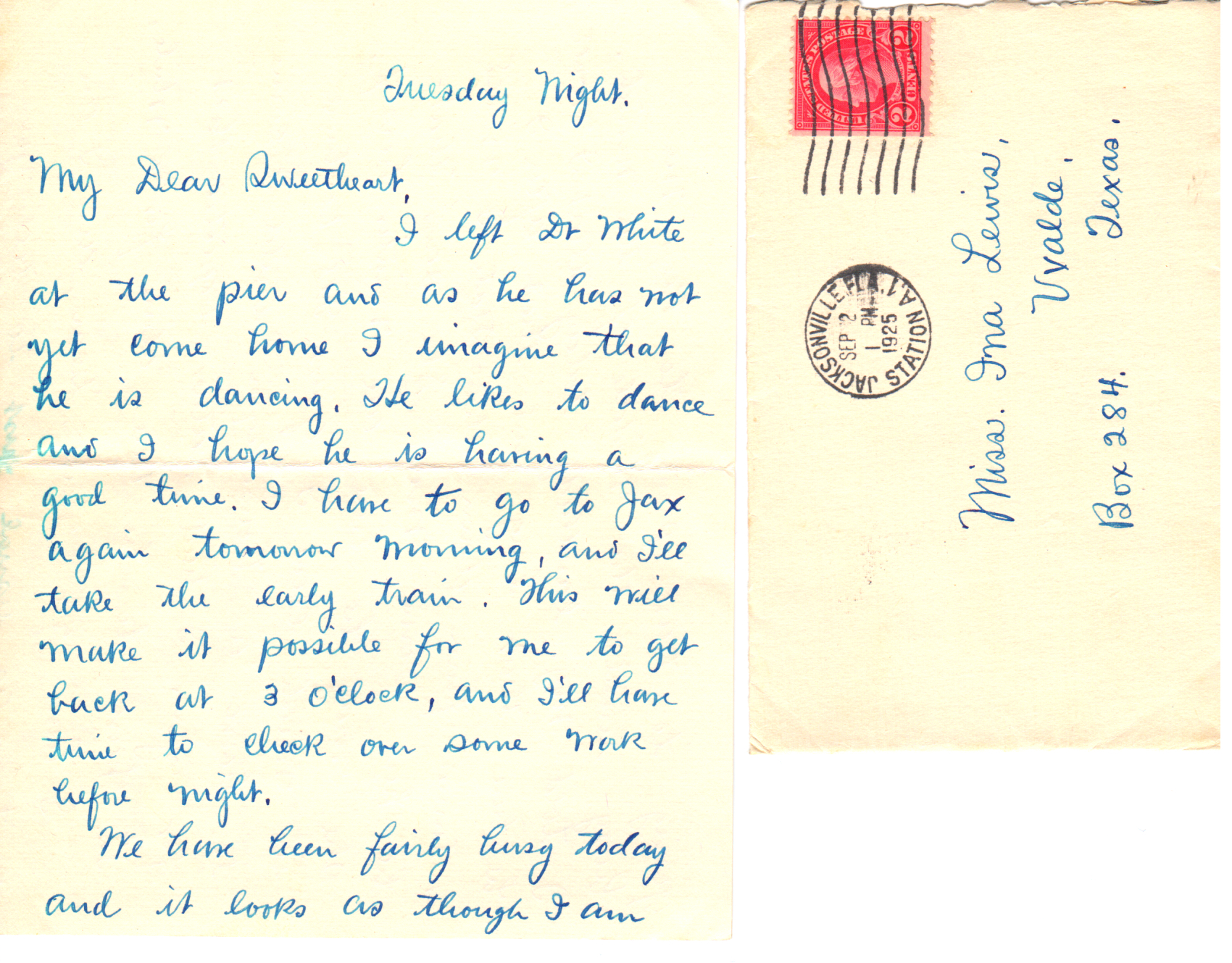 I am going to Jax again tomorrow morning and I guess I’ll be up there most of the day. Dr. White will stay down here. It makes a pretty hard day and he is older than I. He goes in the surf about twice each day and has quite a coat of tan, much more than I have. I believe that he is going to invest in a lot or two here on the beach. He thinks it is mighty fine and that the beach will develop. I believe it will, but I also believe that I made a better purchase at Fulford. I’ll be down there the latter part of the month and will investigate the present value. You did not mention the idea of a homestead, and I guess that it did not strike you favorably. I won’t consider it if you do not approve of it. I want you to know, Dear, that I have no idea of giving you any undesirable place to live. I want it to be such that both of us will enjoy it and I am going to do my best to make it that way.
