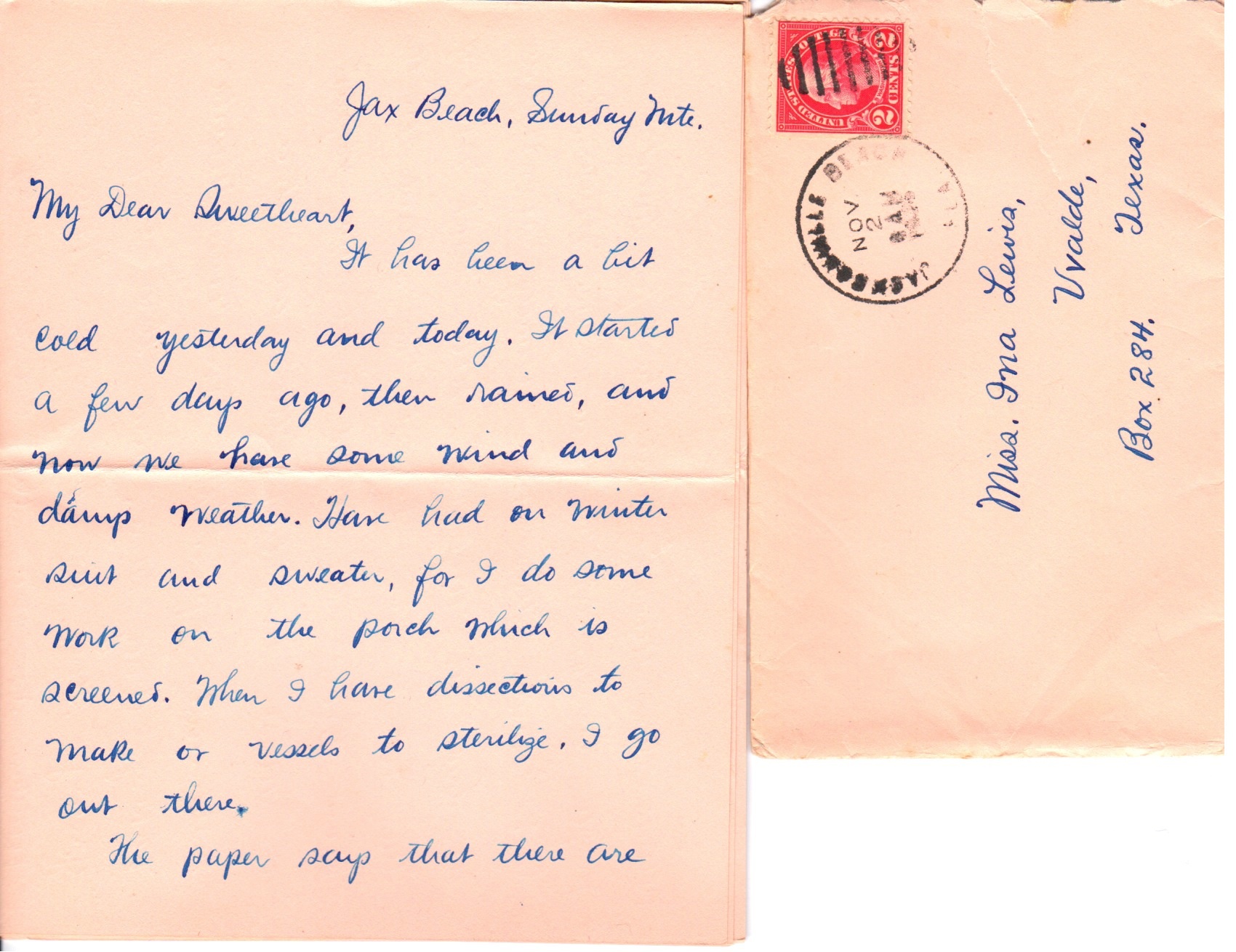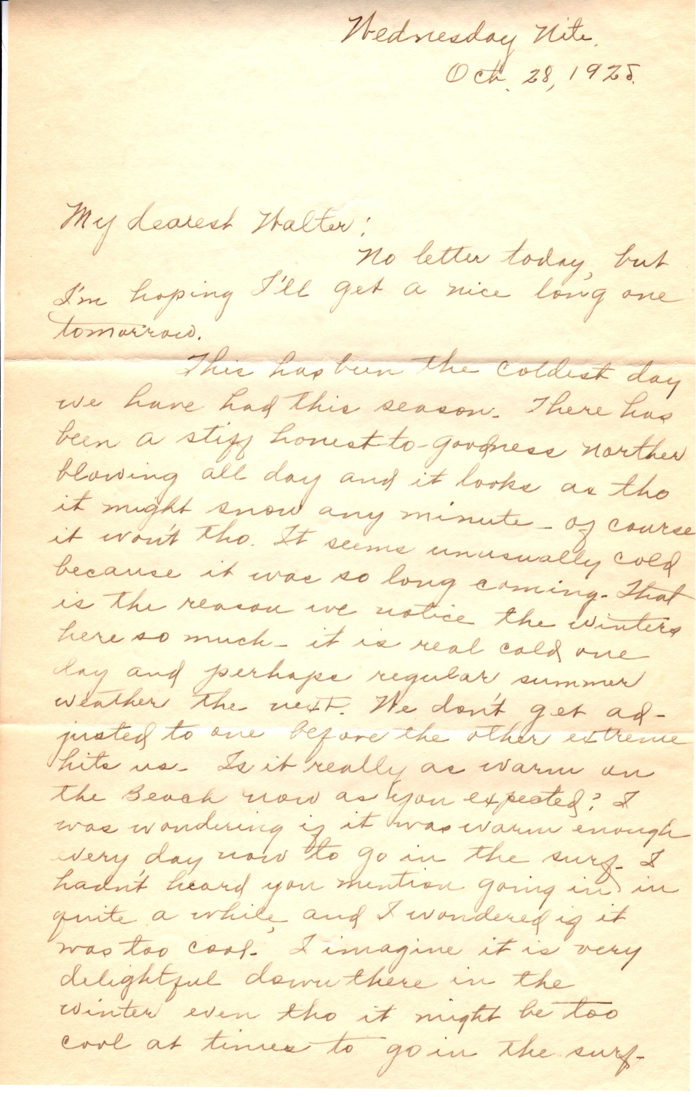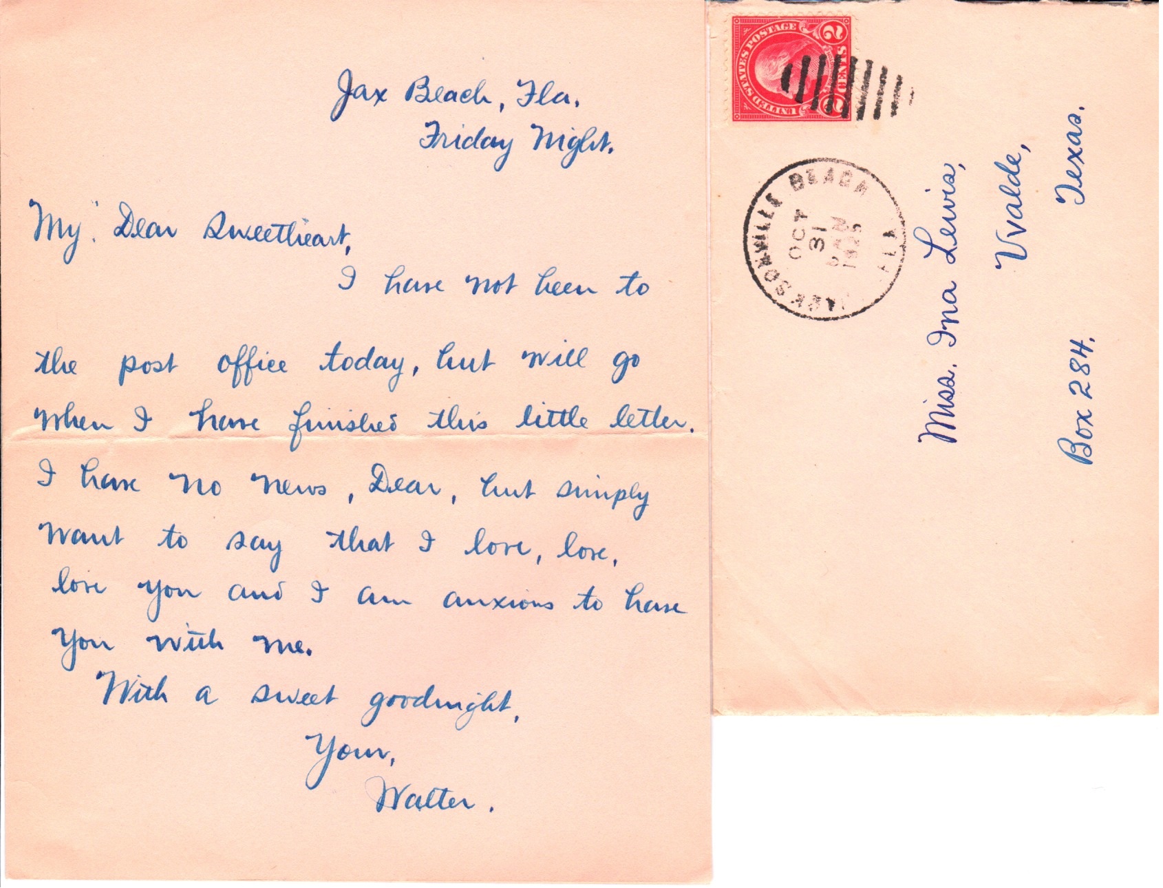 Mama and I didn’t go in town this evening before the post office closed, but I had phoned Bob and asked him to get our mail and carry it to his house so we could get it tonight. He did and we did (get the mail I mean), and that nice long letter of yours was the greatest treat I could have next to being with you in person. Sweetheart, I enjoyed it so much, and I’ll write you more about it tomorrow (I mean today – it is almost 12:30 now).