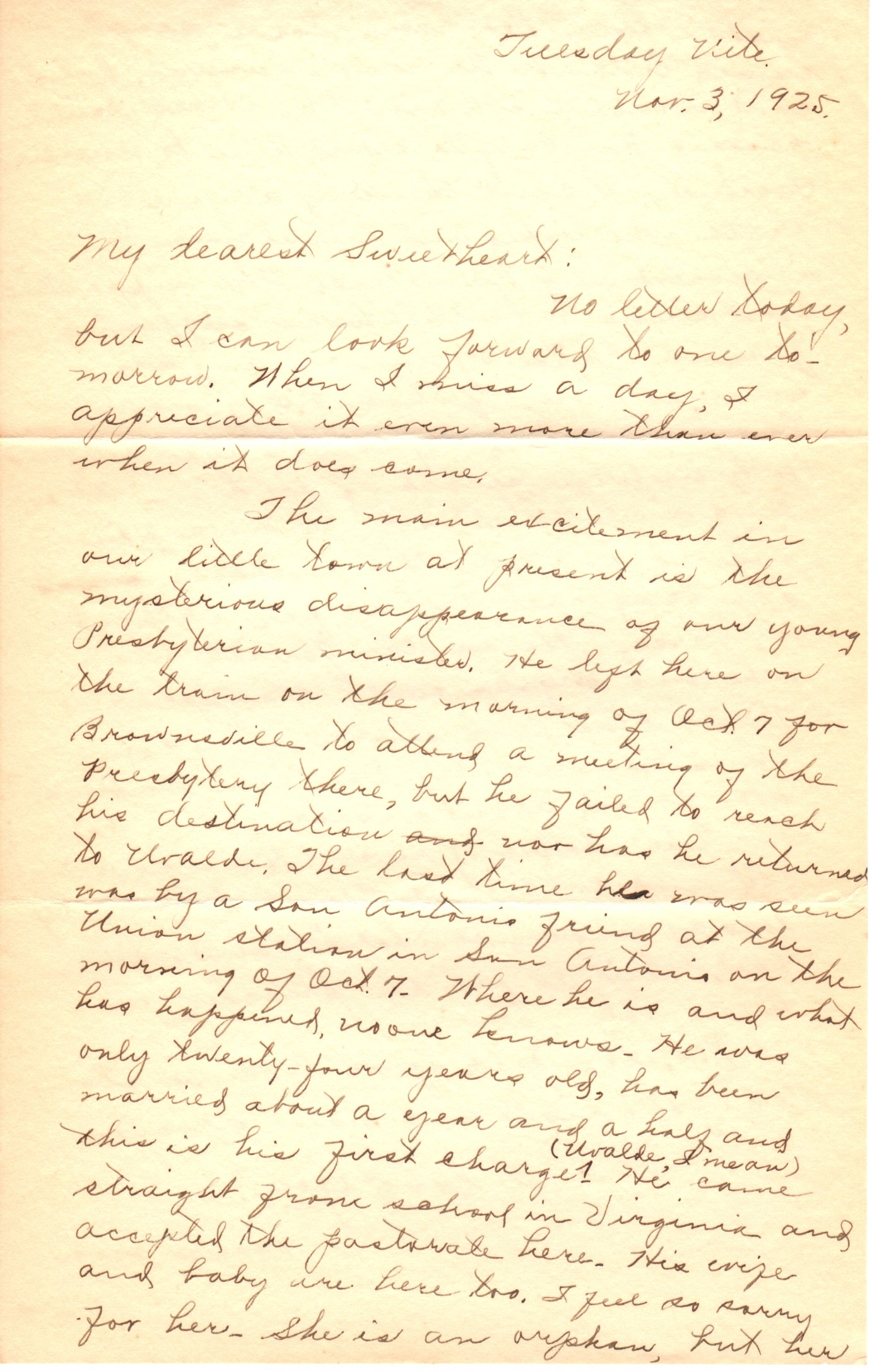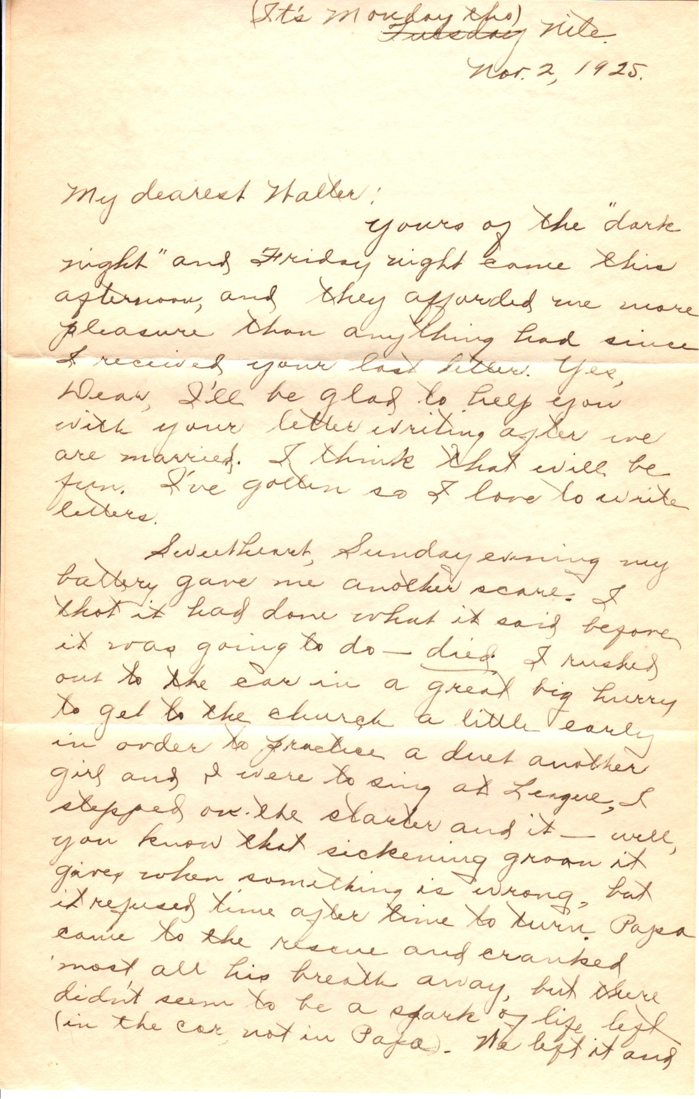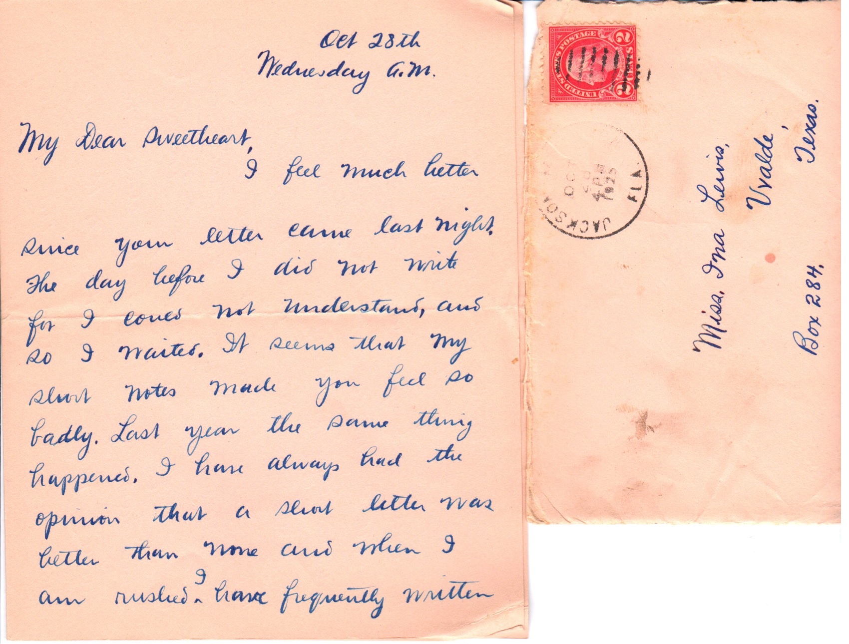 You were writing about someone for Best man in the wedding. I’m sorry Mr. Pettit married so soon because I think it would be fine to have him. It would be fine to have Mr. Parman if he were not married, but, Dear, you see, the Best Man is supposed not to have a wife because the Maid of Honor is unmarried. He will enter the church with you, but, after we meet at the altar and the ceremony is performed, he will march out with the Maid of Honor (who is to be Claudelle) and you and I will go together. You see, if he were married, it wouldn’t be exactly right. Perhaps your brother (if he will be here) or Mr. Poole or someone else would be all right. Of course that is entirely with you, Dear. Anyone you choose will suit me fine. My, I get so enthusiastic when we begin planning about the wedding! Sweetheart, I’m so happy.