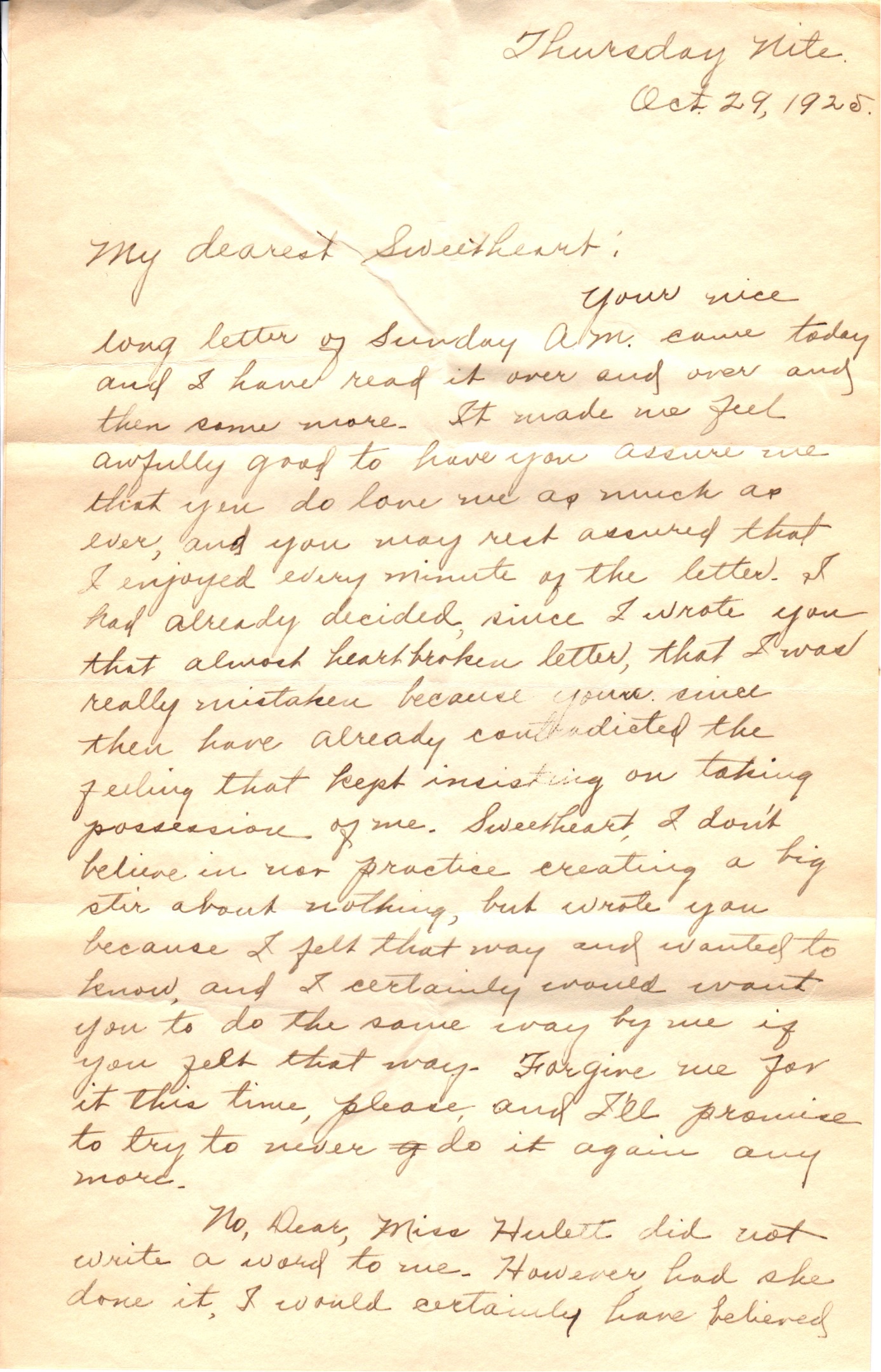 Sweetheart, I have never had anyone else tell me I was unusually sensitive, but I may be. We’ll take it for granted that I am though, and forget it. I’m awfully sorry I created such a misunderstanding but it’s all over now. I don’t want you to feel like you have to be on “needles and pins” for fear I will take “a fence” about anything, because I’m going to be good from now on. I’ll prove to you that I’m not hard to get along with.