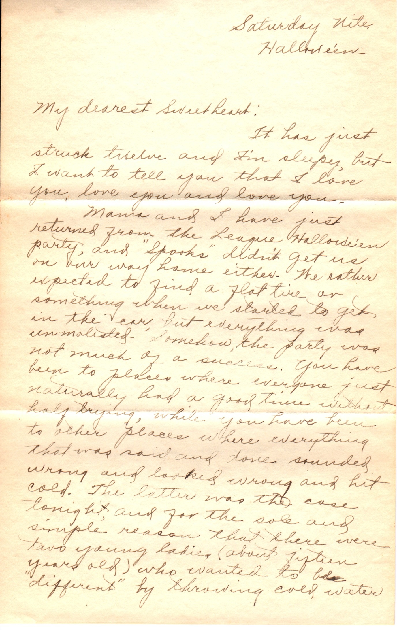 Mama and I have just returned from the League Hallowe’en party, and “Spooks” didn’t get us on our way home either. We rather expected to find a flat tire or something when we started to get in the car, but everything was unmolested. Somehow, the party was not much of a success. You have been to places where everyone just naturally had a good time without half trying, while you have been to other places where everything that was said and done sounded wrong and looked wrong and hit cold. The latter was the case tonight, and for the sole and simple reason that there were two young ladies (about fifteen years old) who wanted to be “different” by throwing cold water on all the entertainment that was attempted. They didn’t want to have a good time, and seemed determined to see that no one else did. You know there is nothing that kills the spirit of fun in a crowd more quickly than that. I felt so sorry for the girl who had charge of the entertainment for the evening. This was only the second time she had served in that capacity, and she feels that she is a miserable failure now, even though she has worked so awfully hard on this party for this evening. I have never seen anyone look more discouraged and disgusted than she did a few minutes ago.