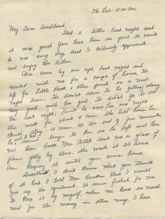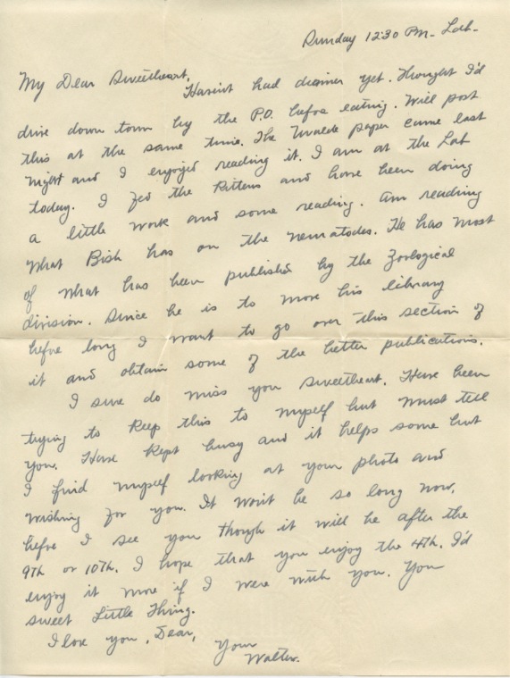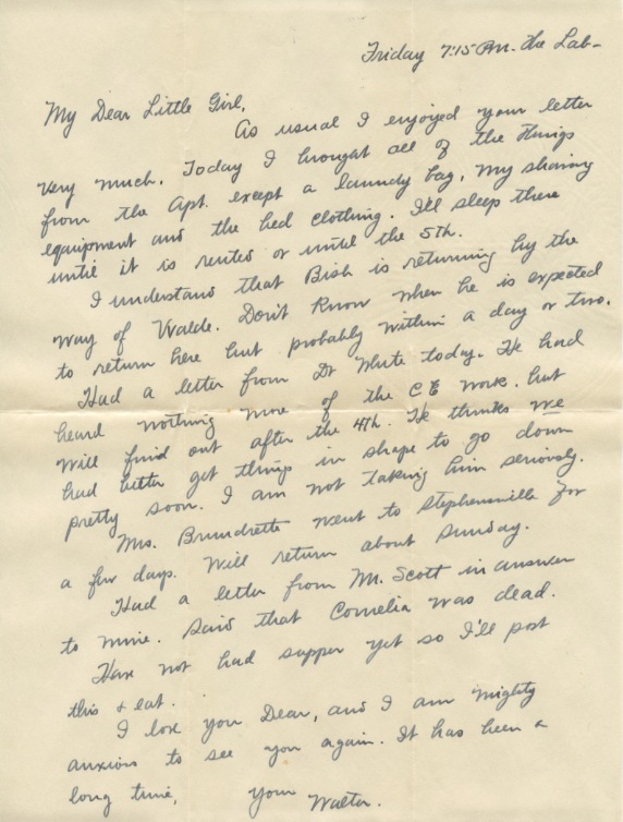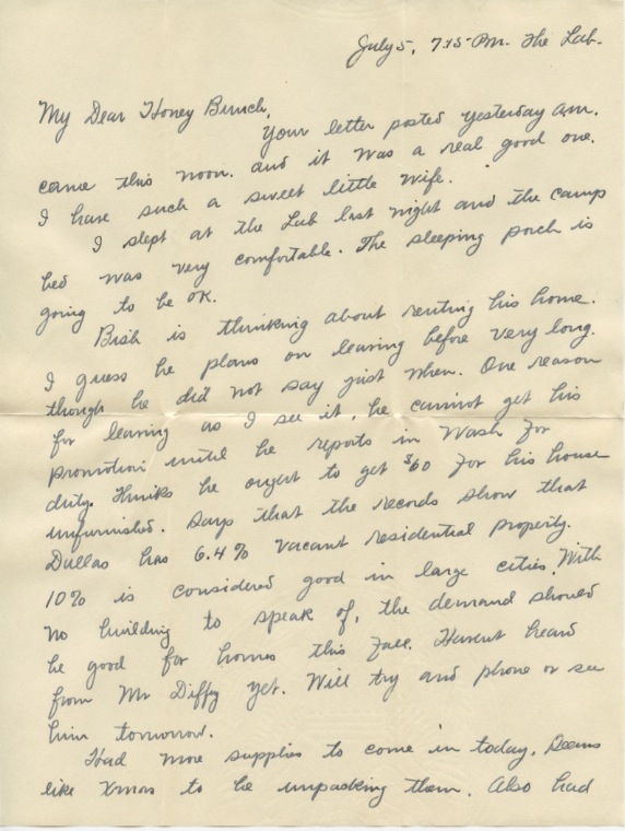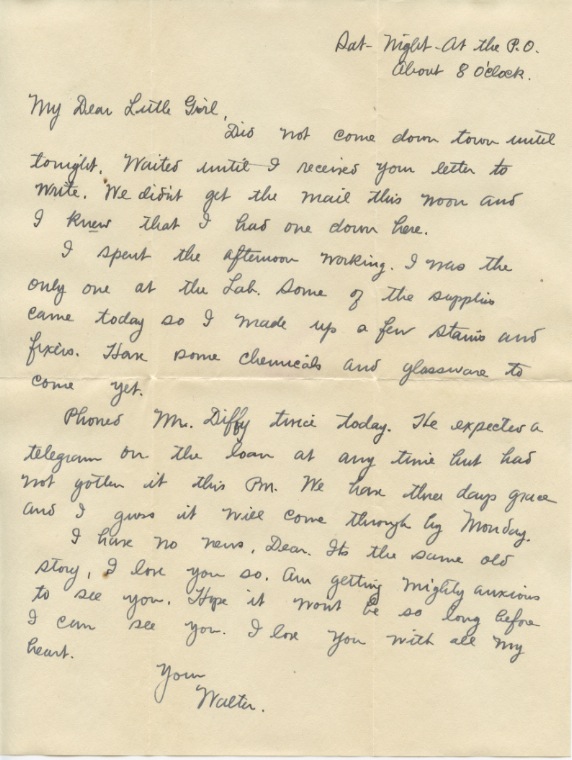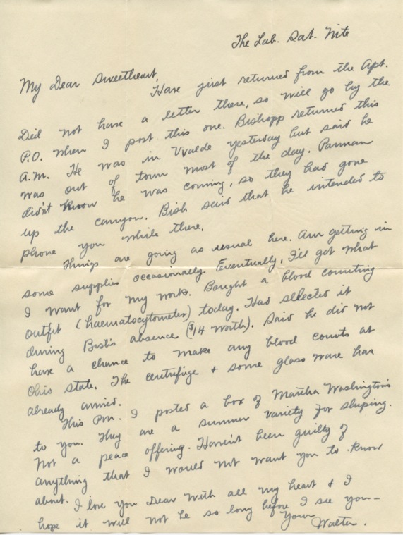 Your letter of Sat nite was received at Box 208 this PM. It had been two days since I had heard from you. We did not have a delivery Sun or today. I presume I’ll have a previous letter delivered to the Apt tomorrow A.M. The key came OK. I did not send the frank because I couldn’t find one in the whole lab. The supplies are exhausted in everything except chemicals and I presume Dr. Roark sees to it that they have these.