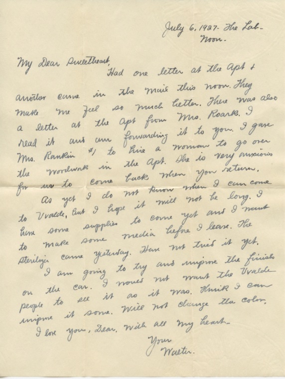 Will try to see Mr. Diffey tomorrow to see if he has heard from the application for the Owenwood lien. Will owe $160 interest and will have some expense on the renewal. Have sent in a request for $150 on advanced funds. This should see us through until August 1st. Hope I can work in an expense % during this month. Will try to work at Uvalde for a couple of weeks. Have no idea when Bish. will go to Wash.