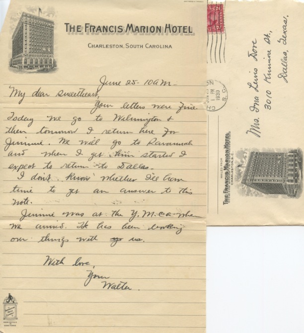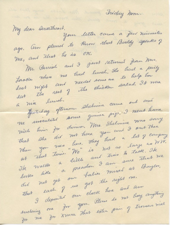 Your first letter and also one from Claudelle were received just as I posted a letter to you. A second letter was received from you today. Thanks! I am mighty glad to know that our son is getting along OK. Shelmire says that he wants his son to be a good quarter back on the team and that he should not be as large as Walter White. He thinks Walter White should be large enough to play “center.”
