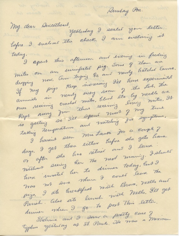 Have been feeding mites until it is getting old. Have been using a non infected strain on an infected guinea pig. When these are 7 to 10 days older I’ll feed them on a “clean” pig. Some are to be used for other inoculations and fixations. We, also, have another strain of mites brought in from Henderson by Mr. Somier. We will try to feed them on a clean pig.