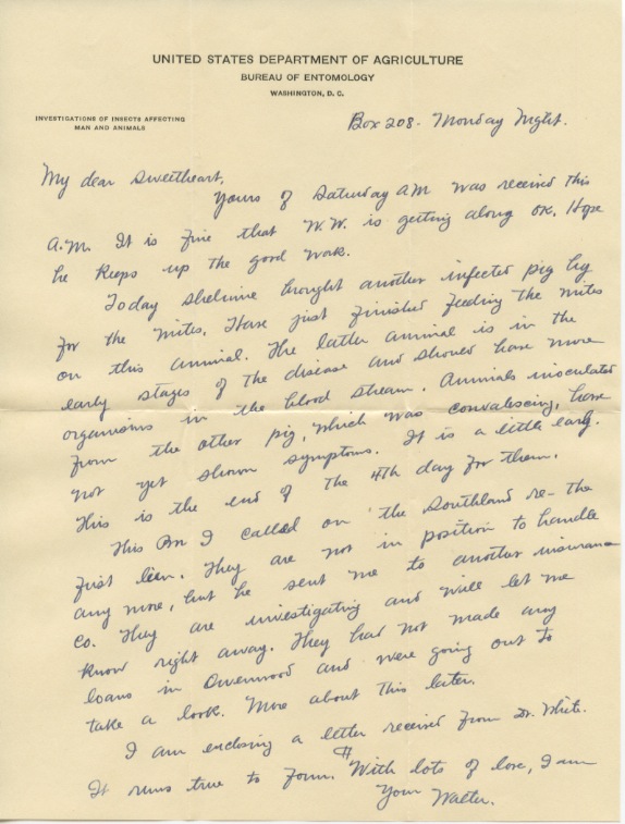 Got a supply of mites from Oak Cliff Sunday PM and another lot yesterday PM. Am getting some to feed on the pig sick with typhus. Shelmire will be out this afternoon.