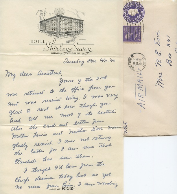 Yours of the 31st was returned to the office from you and was received today. I was very glad to read it even though you had told me most of its contents. Also the card and letters from Mother Lewis and Mother Dove were gladly received. I am not returning the latter for I am sure that Claudelle has seen them.