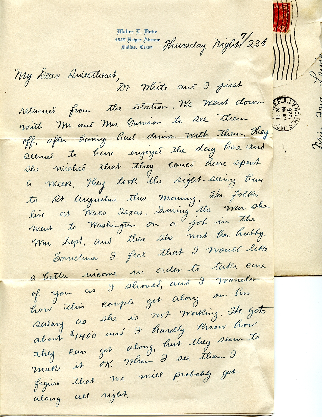 Dr. White and I just returned from the station. We went down with Mr. and Mrs. Garrison to see them off, after having had dinner with them. They seemed to have enjoyed the day here and she wished that they could have spent a week. They took the sight-seeing bus to St. Augustine this morning. Her folks live at Waco Texas. During the war she went to Washington on a job in the War Dept, and there she met her hubby.