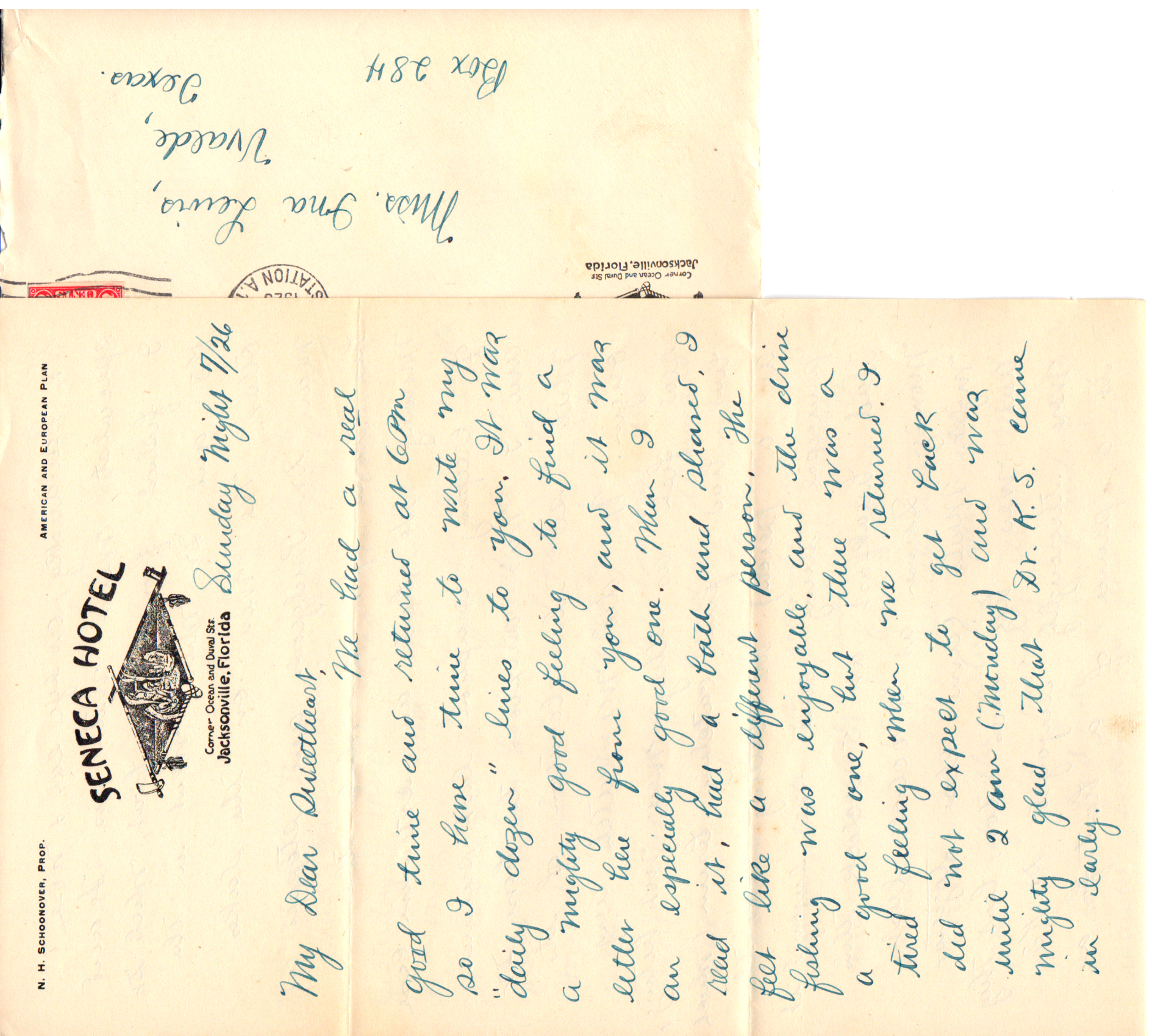 Am taking the early train for Jax. Dr. K.S. and I will leave about noon. It will hardly be possible for me to write you tomorrow night as we will stop at a private home on the river & it will be late by the time we will have arranged for a boat and a Negro to row. But I’ll be thinking of you just the same and I’ll wish for you a great many times. I will spend Sunday night at Dr. K.S. home. We will probably get there about 2AM. Monday. Will write again Monday night, Dear.