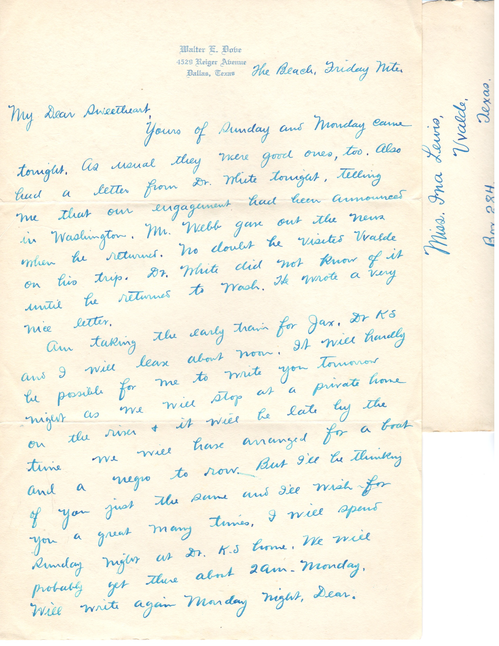 Yours of Sunday and Monday came tonight. As usual they were good ones, too. Also had a letter from Dr. White tonight, telling me that our engagement had been announced in Washington. Mr. Webb gave out the news when he returned. No doubt he visited Uvalde on his trip. Dr. White did not know of it until he returned to Wash. He wrote a very nice letter.