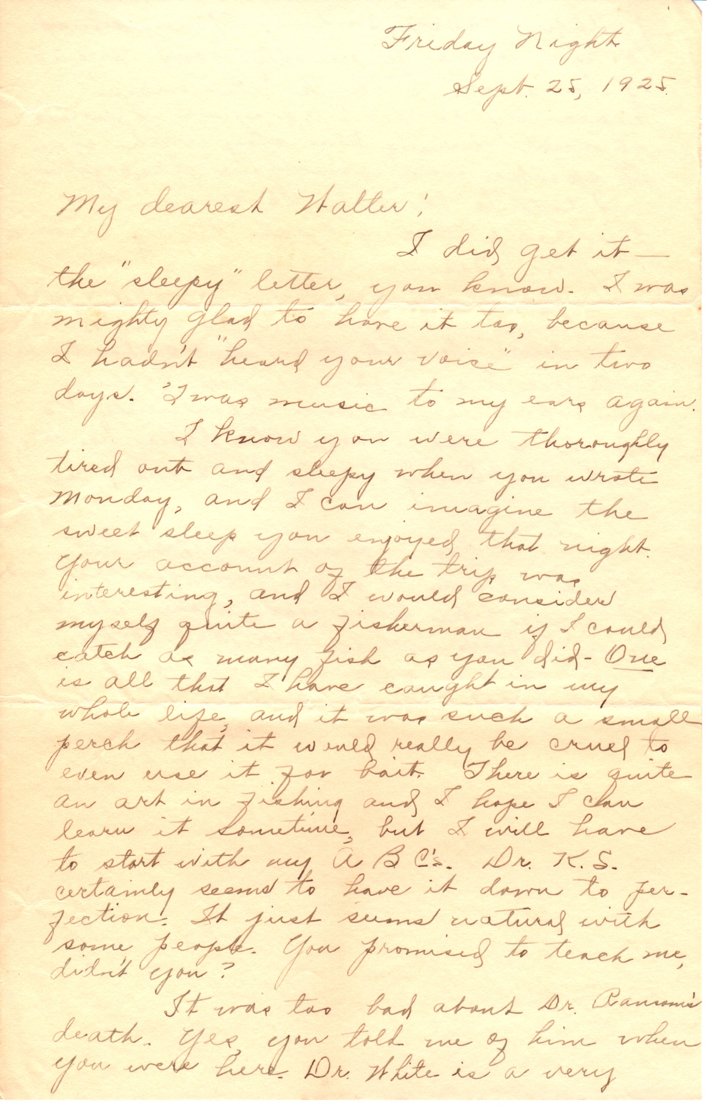 I know you were thoroughly tired out and sleepy when you wrote Monday, and I can imagine the sweet sleep you enjoyed that night. Your account of the trip was interesting, and I would consider myself quite a fisherman if I could catch as many fish as you did. One is all that I have caught in my whole life, and it was such a small perch that it would really be cruel to even use it for bait. There is quite an art in fishing and I hope I can learn it sometime, but I will have to start with my A B C’s. Dr. K.S. certainly seems to have it down to perfection. It just seems natural with some people. You promised to teach me, didn’t you?