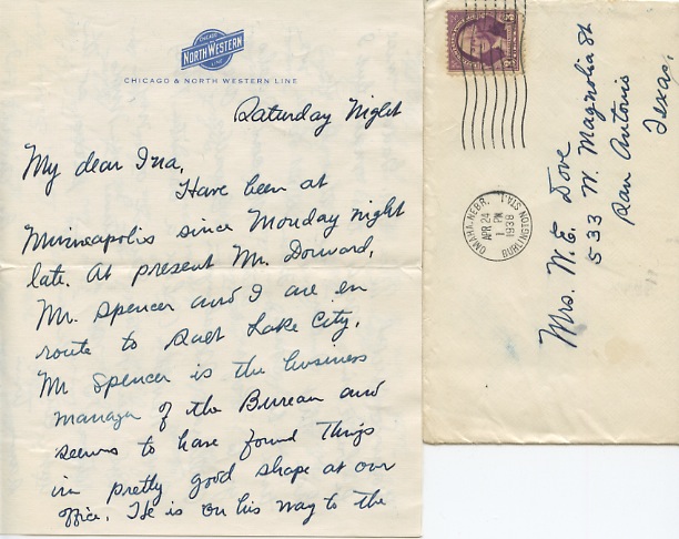 Have been at Minneapolis since Monday night late. At present Mr. Dorward, Mr. Spencer and I are en route to Salt Lake City. Mr. Spencer is the business manager of the Bureau and seems to have found things in pretty good shape at our office. He is on his way to the Mormon cricket office. Mr. Gaddis will be back in Mpls this week but I hope that I can be there by the time he comes. From Salt Lake we go to Logan Utah, Moscow Idaho, Pullman Washington, Corvallis Oregon, Reno Nevada (I have a committee there) and perhaps to Denver on my return. I need the time at Mpls but can’t be in two places at the same time.