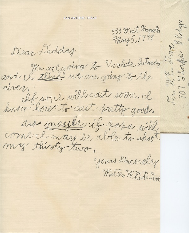* In case anyone reaches this post through a Google search and is confused, this is a letter sent by a little boy named Walter W. Dove to his father, Walter E. Dove, in 1938. Neither had anything to do with the characters in Breaking Bad.