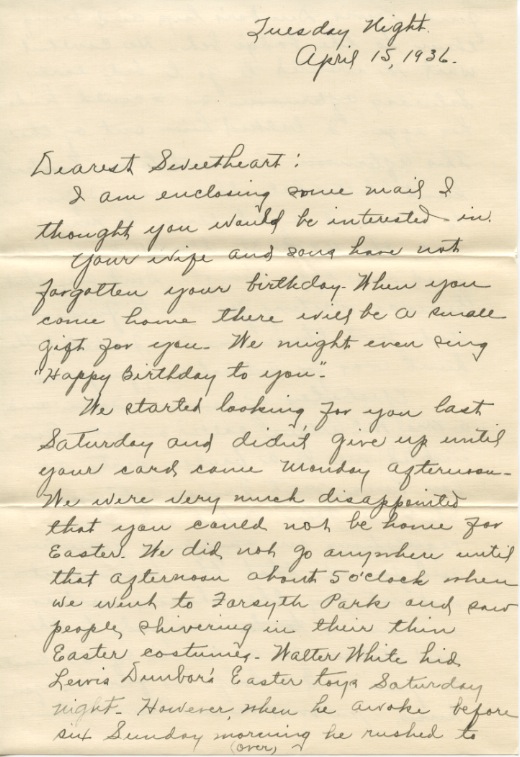 We started looking for you last Saturday and didn’t give up until your card came Monday afternoon. We were very much disappointed that you could not be home for Easter. We did not go anywhere until that afternoon about 5 o’clock when we went to Forsyth Park and saw people shivering in their thin Easter costumes. Walter White hid Lewis Dunbar’s Easter toys Saturday night. However, when he awoke before six Sunday morning he rushed to find Lewis Dunbar’s toys and bring them to the baby’s bed. He couldn’t wait. He wanted to go to bed early Saturday afternoon so I could hide his eggs. I talked him out of that. This afternoon he went to an Easter hunt (better late than never!) given to a crowd of children by Mr. Orsini and the 49th St. druggist. He didn’t find any eggs though. Don’t say that he was waiting for me to find them and put them in his pockets! The hunt was for advertising purposes.