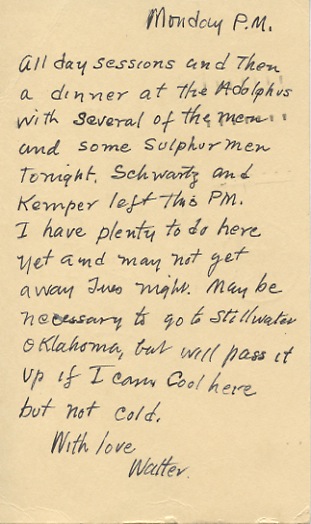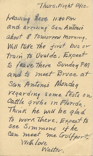 I met Prof. Harris of Miss. A&M this noon and have spent most of today with him. He seemed just as interested in me as when I left college and has been quite an inspiration to me. He has been talking to me regarding a PhD degree. He thinks that now is the time for me to work for it. I have been thinking of this for some little time and if possible I want to arrange so that I can get credit for my work with the Bureau.