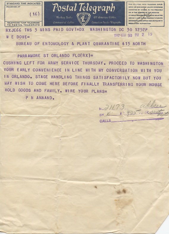 Cushing looks just fine as a Major and he joined me in a conference with Dr. Annand. This had to do with Army & Bureau services, also use of other entomologists in the Army. Saw Rohner and Hoyt in the hall and they were most cordial. Dr. B. came in at 5:30 and welcomed me to the city. This was in the presence of Claudelle. Claudelle and I ate dinner together and she went to Clarendon on a bus. She had parked her car there. Tomorrow she is going to drive in and I will go out there tomorrow night. She is helping find me a house for us, but has no encouragement so far. She asks if we want to buy a place. I’ll see Cushings, but I understand from C. that Deniza wants $100 per month for her place furnished. They can sell OK if they want to. Annand is building a new home and his may be available. I may inquire about it.