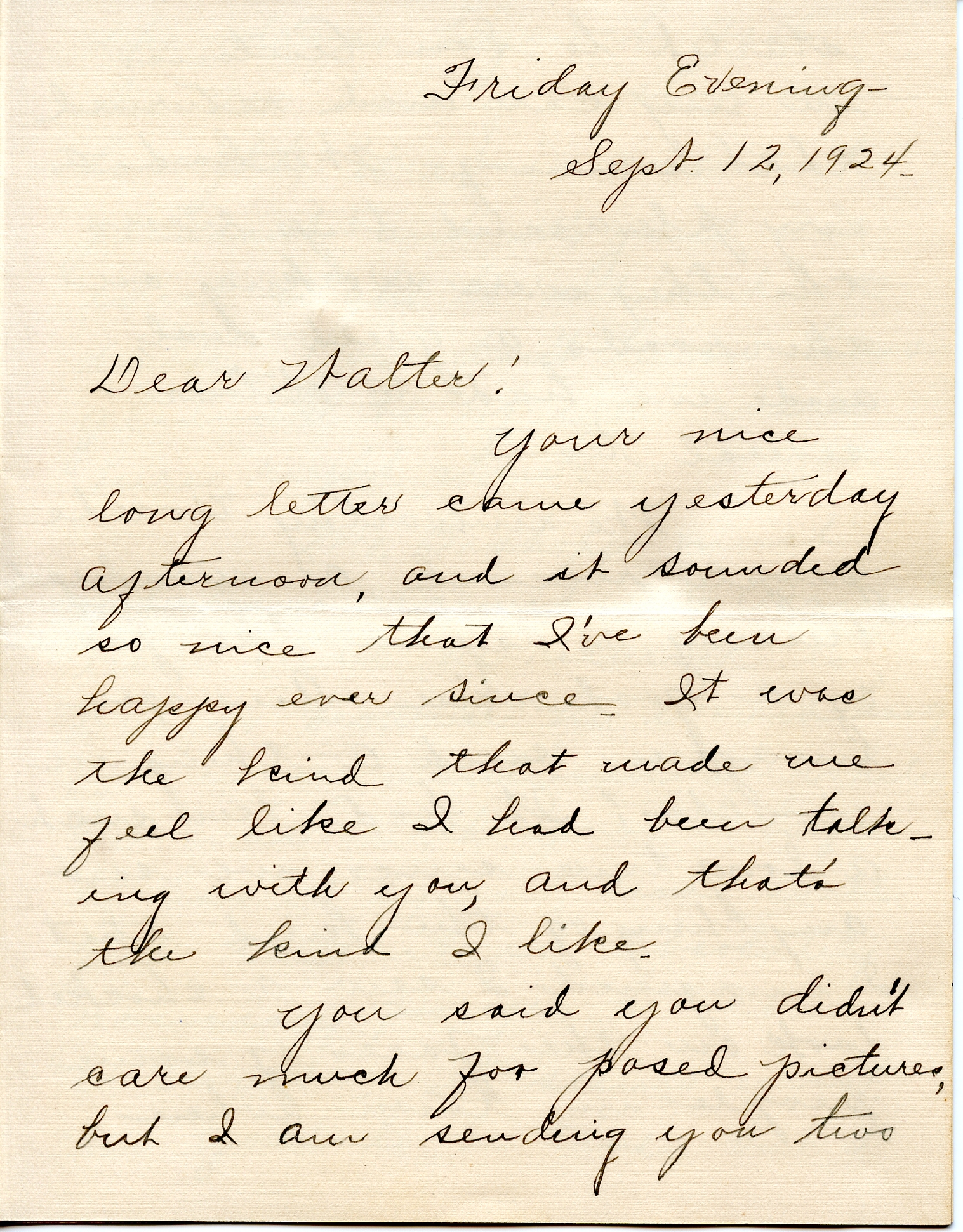 Your nice long letter came yesterday afternoon, and it sounded so nice that I’ve been happy ever since. It was the kind that made me feel like I had been talking with you, and that’s the kind I like.