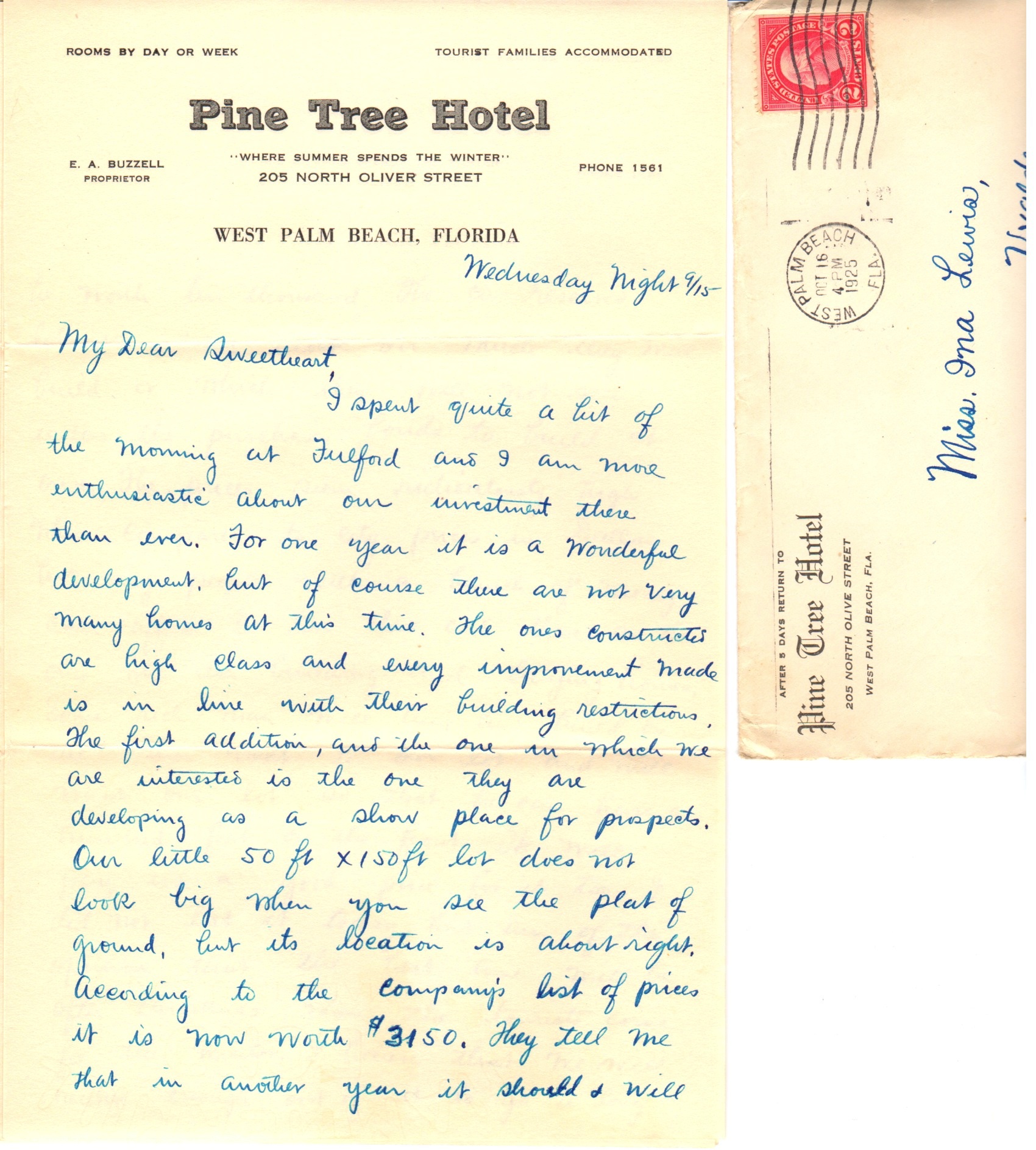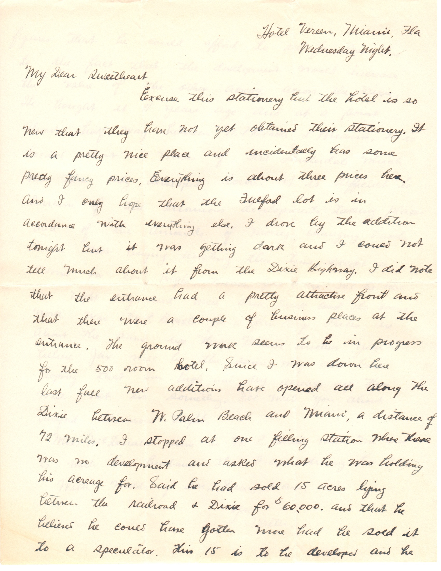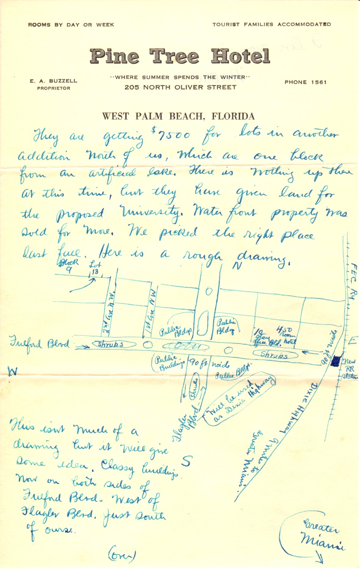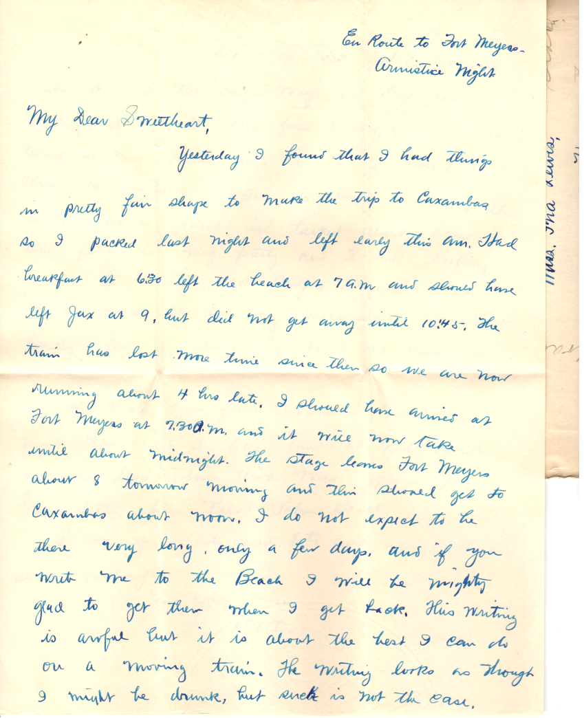 I arrived here about two hours ago or less and our train was about four hours late. All trains run late down here except the beach train which went out on time this morning and left me to wait until this PM. But I had a few things to do, including the writing of this letter which is by far the most important. Had to go to the bank about the first thing. I didn’t buy anything down the state either, except meals and lodging.