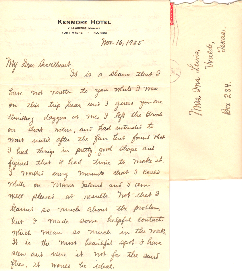 If the sand fly money is obtained OK, it would be a good idea to have you go to Marco with me for a little trip after Xmas. During that time the govt will probably offer its land for sale down there and we may want our home there. I don’t like the idea of taking you where those things will bite you, but if everyone else depends on me to help them, maybe you would do the same thing.