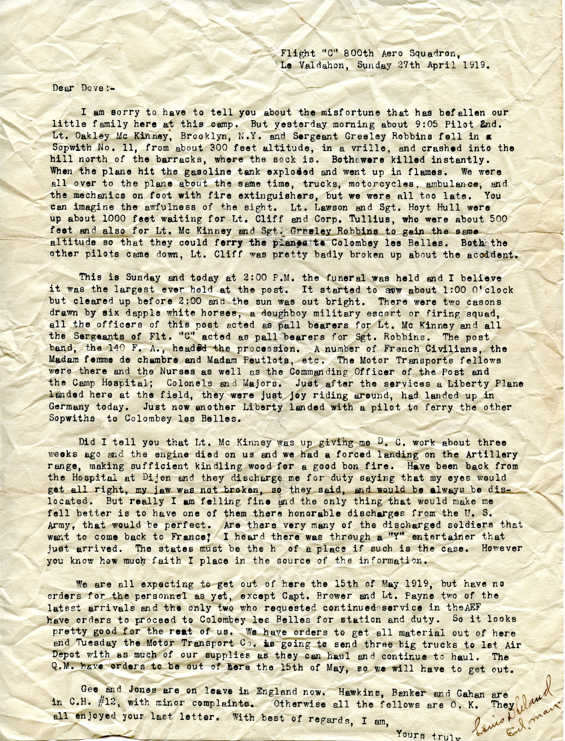 As you know, I trained in the infantry in the States and was transferred to the Aviation Section as a ground officer, which was due to the fact that there was a shortage of ground officers for this branch of the service. By doing this I was sent “over here” much sooner, and I am very glad that I made the change. Not because I dislike infantry, for such is not the case. I am still very much interested in infantry operations, and at times I feel that I could be doing more in that service.