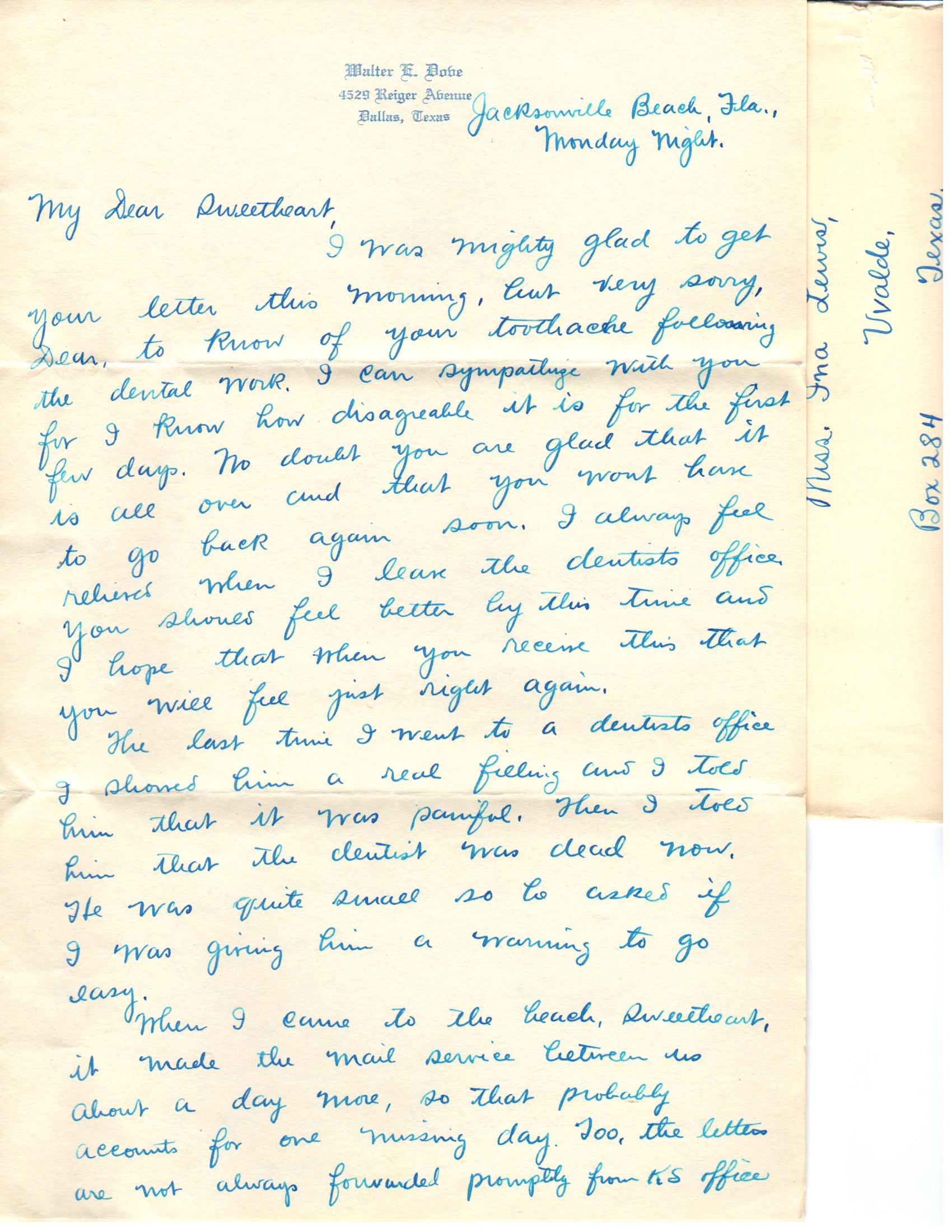 I was mighty glad to get your letter this morning, but very sorry, Dear, to know of your toothache following the dental work.* I can sympathize with you for I know how disagreeable it is for the first few days. No doubt you are glad that it is all over and that you won’t have to go back again soon. I always feel relieved when I leave the dentist’s office. You should feel better by this time and I hope that when you receive this that you will feel just right again.