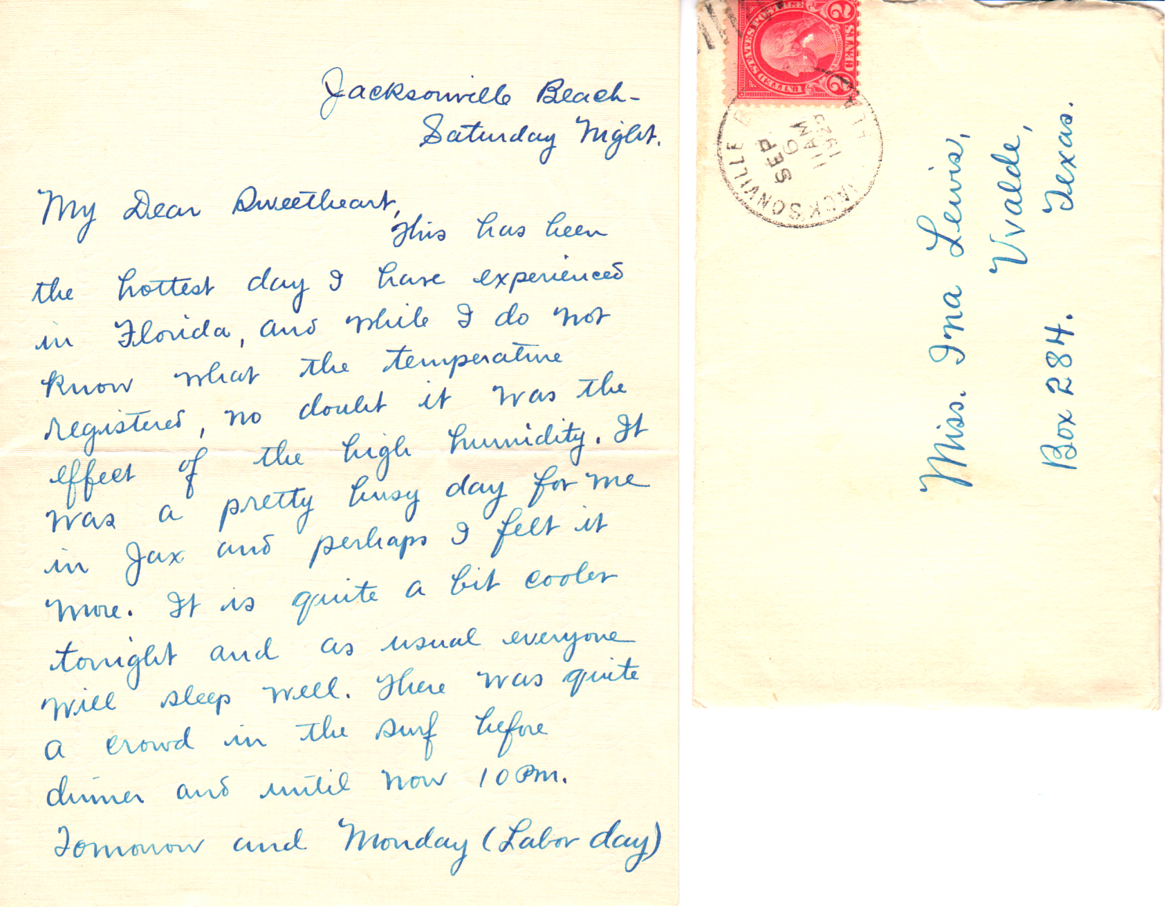 Your note of Thursday night came this afternoon, and I appreciated it just as much as I would have a long letter because the spirit was there just the same. Of course I enjoy the longer ones more because they last longer, but this one was fine as long as it lasted. Of course we can’t always have lots of news to write because we write so often, but your letters are interesting to me – very very interesting – even though they might not contain a single thing that outsiders would call “news.” If you didn’t say a thing except “I love you” I would get quite a thrill out of it. I wish I could have been with you the night you wrote the note. Yes, Dear, a nice quiet place like the beach would be fine for a honeymoon. It would please me very much and I am sure I wouldn’t get lonesome if you were there.