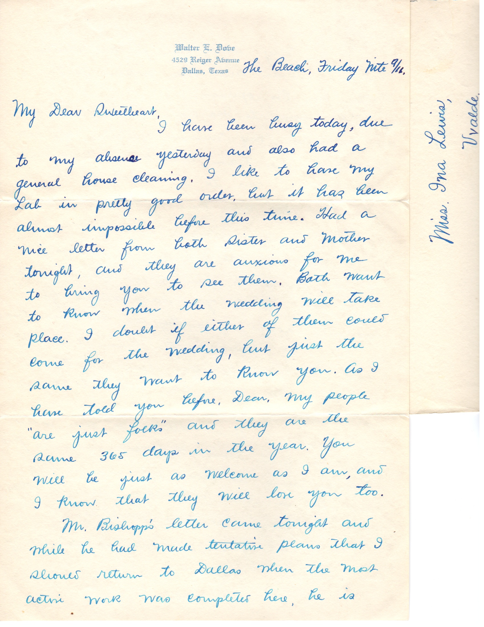 Dr. White’s train did not leave until 6PM which was after my train returned to the beach. He enjoyed it here and said that he would like to stay right here and keep on this problem. He really hated to leave. This was not due to my hospitality in particular, but the problem is so interesting and the climate and conditions for the work were so good that I believe that this accounts for his enjoyment. He invited me to use his lab in Washington at any time and assured me that there would always be room up there if I wanted to do some work there. Before leaving, we went back to the real estate office and he invested in three more tracts of land, making five in all. He is thoroughly sold, and will go back to Washington as a Florida booster. This gives him 50 acres and I really believe that within a year, one tract can be sold for enough to pay for the other four. $75 per acre is not much for acreage high and dry, so near a fast growing city. In Dallas, Mr. Munger of the Continental Gin Co. paid $163,000 for his 163 acres of land which at that time was miles from any development in the city. This was about 1912. The land was not adapted for any use as it was rough and cut into by small ravines. He developed this, with building restrictions for nice two story homes only, and in this one development he made a small fortune. The same thing has been accomplished in most every city showing growth, and I really believe that our acreage and also Dr. White’s will be suitable for use in such an addition here. It would not be unreasonable to suspect that this property may be wanted for a similar development and which would bring $1000 per acre or more. The Miami people here paid much more than this for some of their tracts. At $75 per acre, with the knowledge that this could not be bought after the 20th of this month for less than $100 per acre, it is a mighty safe and conservative investment. Here’s where Mr. & Mrs. Dove will cash in something, and Dear it will come in mighty handy for us.
