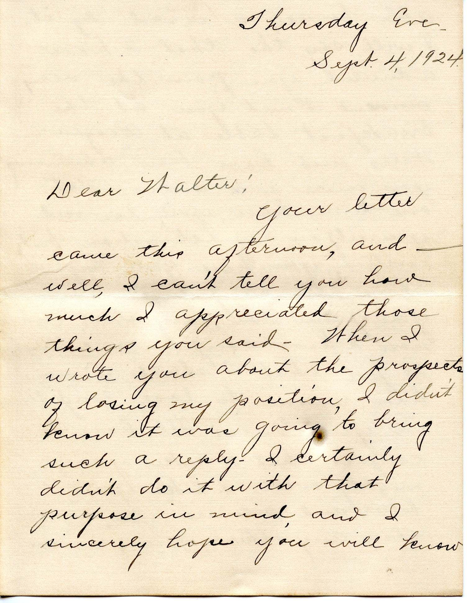 Your letter came this afternoon and – well, I can’t tell you how much I appreciated those things you said. When I wrote you about the prospects of losing my position, I didn’t know it was going to bring such a reply. I certainly didn’t do it with that purpose in mind, and I sincerely hope you will know that I didn’t. I believe you know me better than to think I would do anything like that, don’t you? I hope so. In fact if you thought I was that kind of a girl, I don’t believe you would have said what you did.