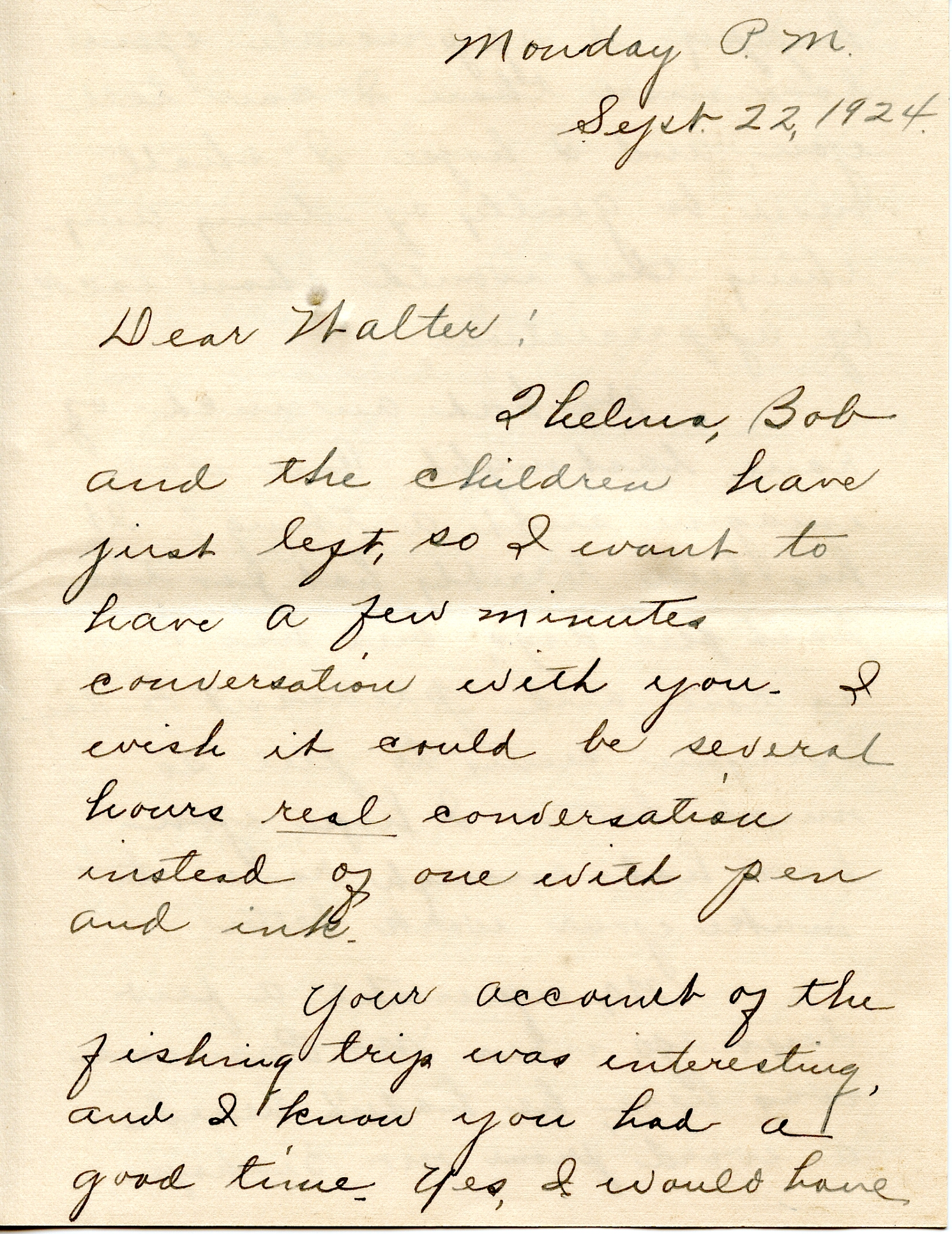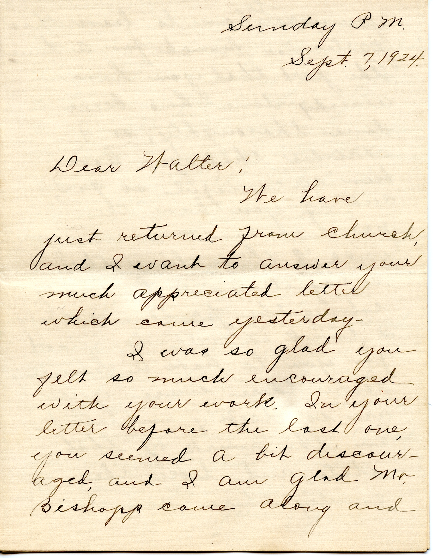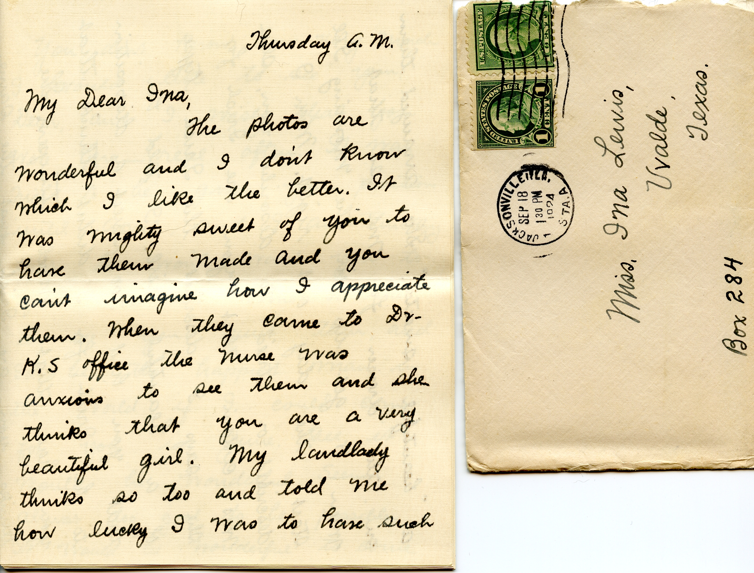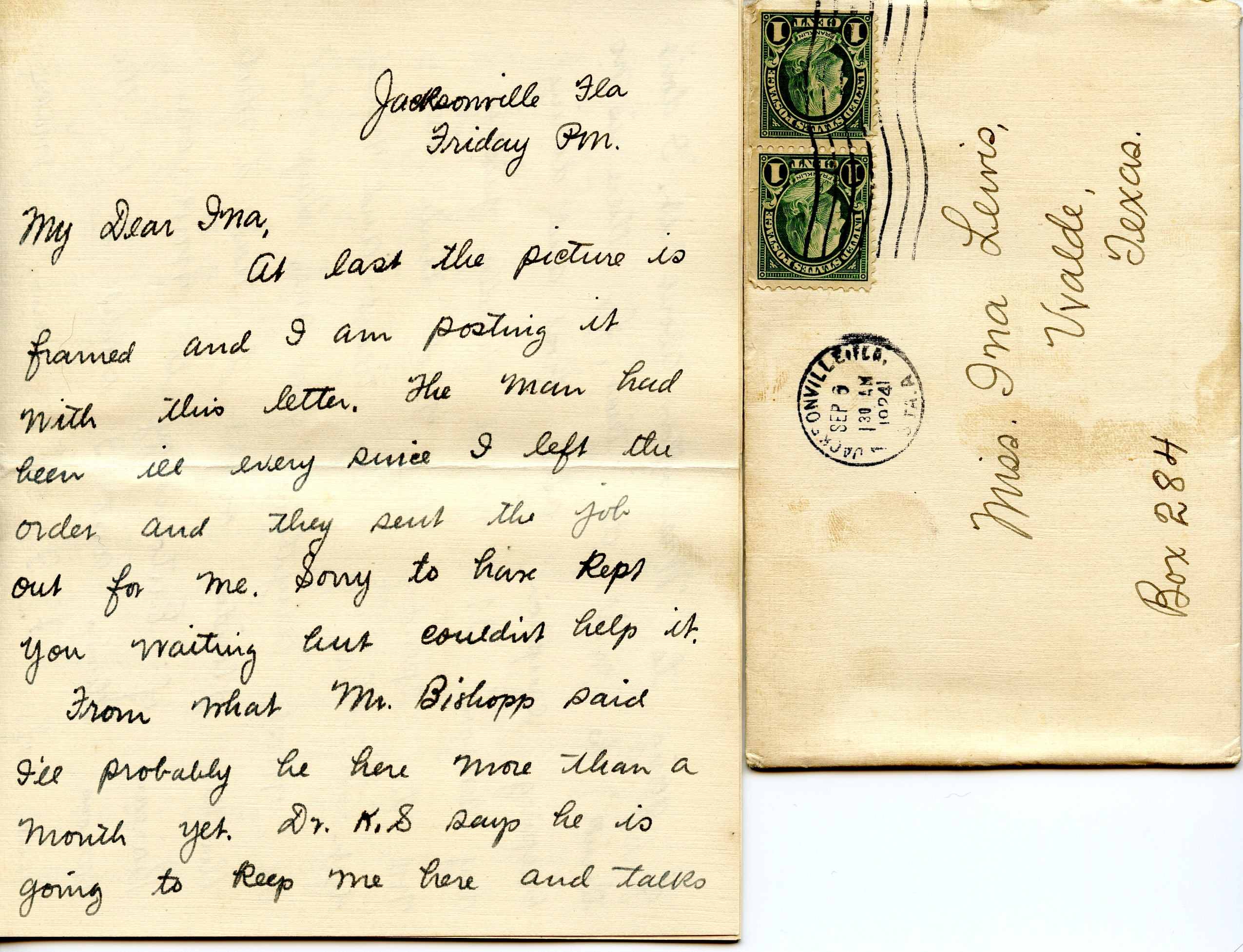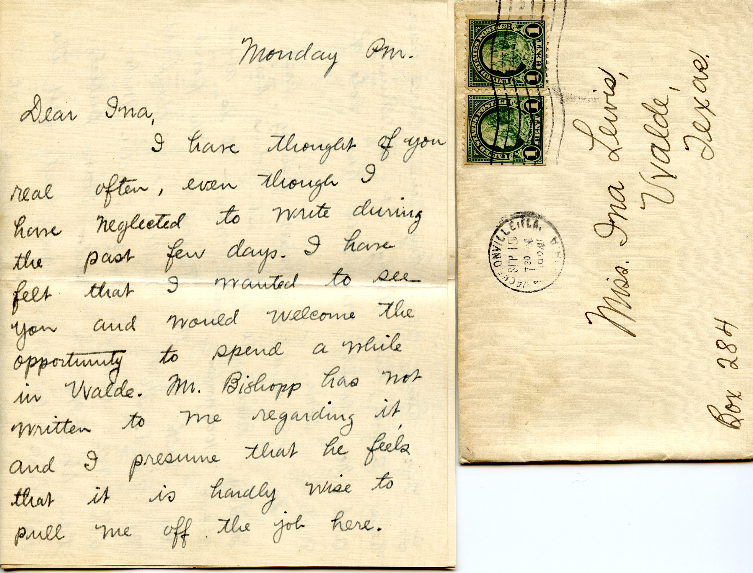 I had the most pleasant surprise a few evenings ago. Claudelle and I went up to Mr. and Mrs. Parman’s, and, while they were talking of the visit they expect to make to Tenn. in October, Mr. Parman stated that he had written Mr. Bishopp, asking him if you could come to Uvalde to take up his work during his absence. I am afraid I didn’t succeed very well in hiding my joy over the possibility of your being here during that time. I didn’t intend writing you anything about it, because I thought I would let you mention it to me first, but you didn’t say a word about it in your letter today. Are you going to accept? I would be so glad if you would – that is, of course, if you thought it best. We would have a good chance to know each other then. I am so anxious to know whether or not you are coming.