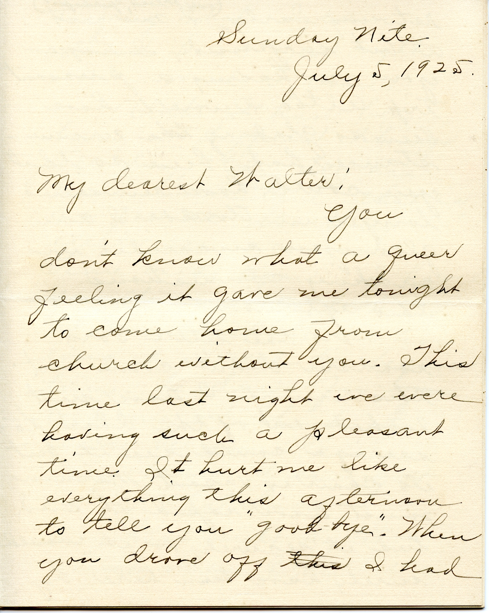 You don’t know what a queer feeling it gave me tonight to come home from church without you. This time last night we were having such a pleasant time. It hurt me like everything this afternoon to tell you “good-bye.” When you drove off I had such a lost, sinking feeling. A lump came in my throat, but I swallowed it because Mr. and Mrs. Parman were right there. They must have had an idea about it because Mrs. Parman made a few appropriate remarks about how lonesome I would be after you left etc.